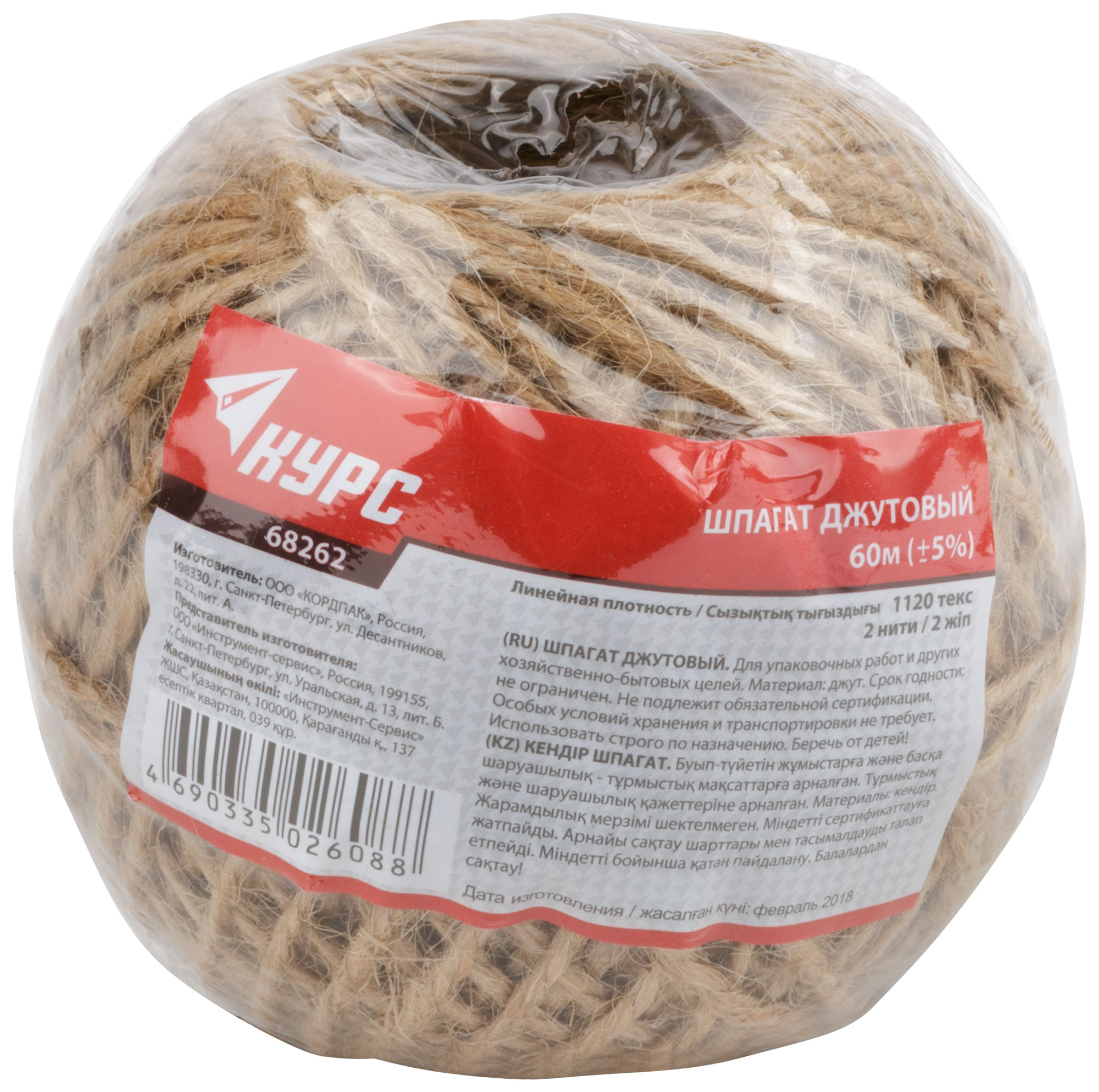 Шпагат изготовлен из натурального джута, что обеспечивает его прочность и долговечность. Длина шпагата составляет 60 метров, а его двухниточная структура и плотность в 1100 текс гарантируют надежность в использовании.