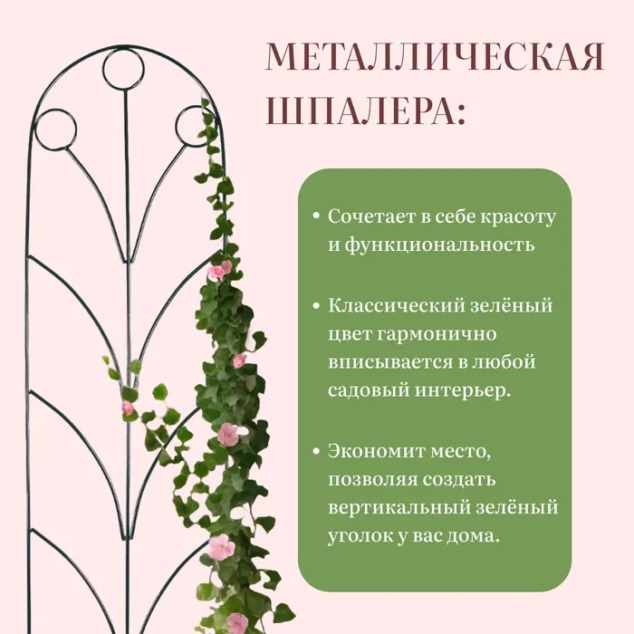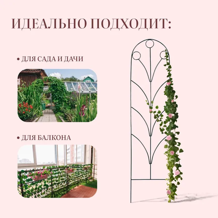Эта конструкция подходит для разнообразных растений: от ароматных цветов до плодоносящих кустов. Организуйте свой вертикальный сад на балконе или в саду, создавая небольшой оазис в бетонных джунглях. Зелёная металлическая структура станет надёжной опорой для лиан, создавая природный экран или стильный декоративный элемент.