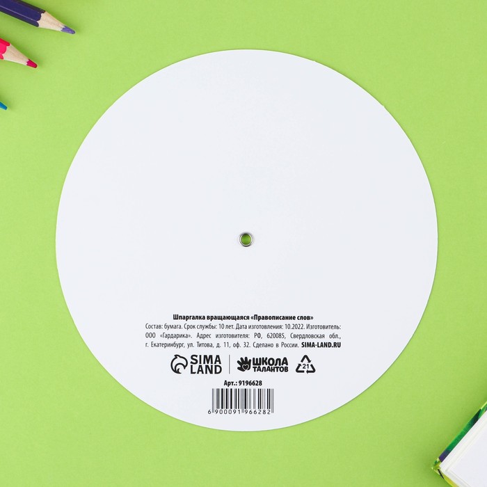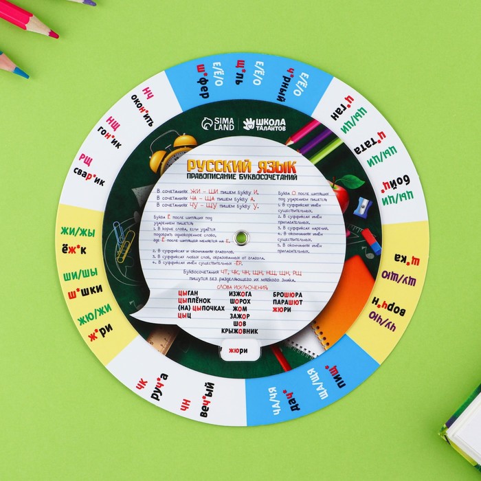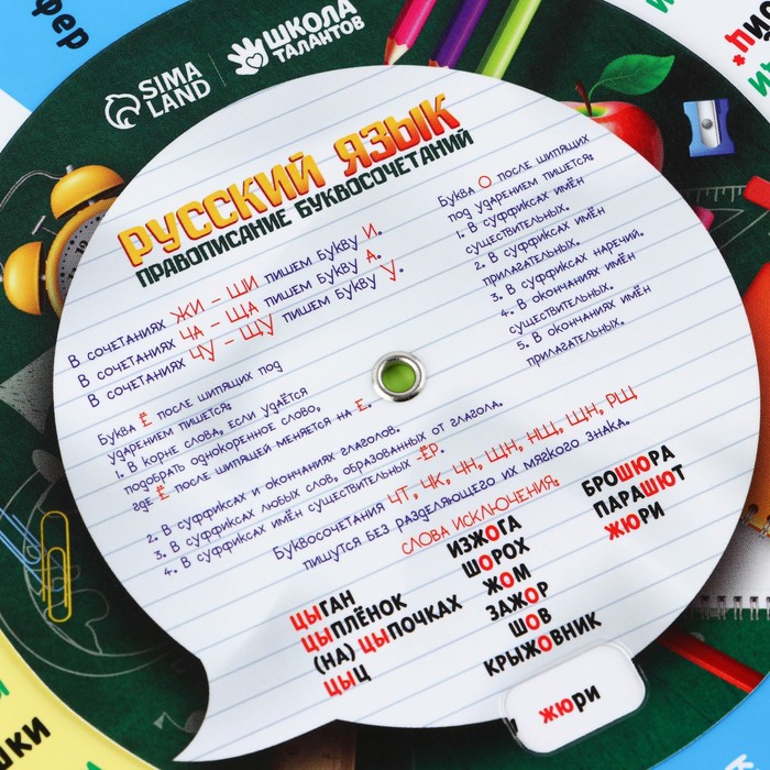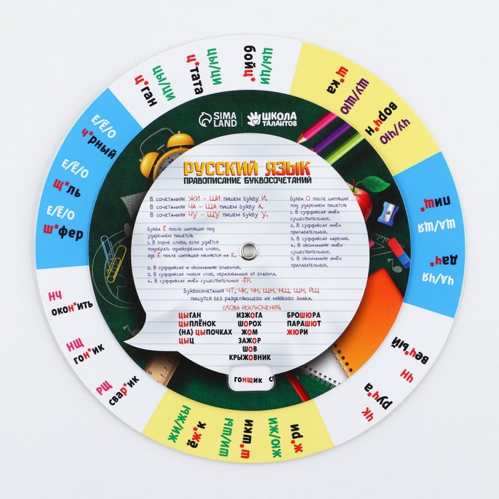 Вращающаяся картонная шпаргалка «Правописание слов» поможет вашему ребёнку изучить и запомнить основные правила правописания буквосочетаний.