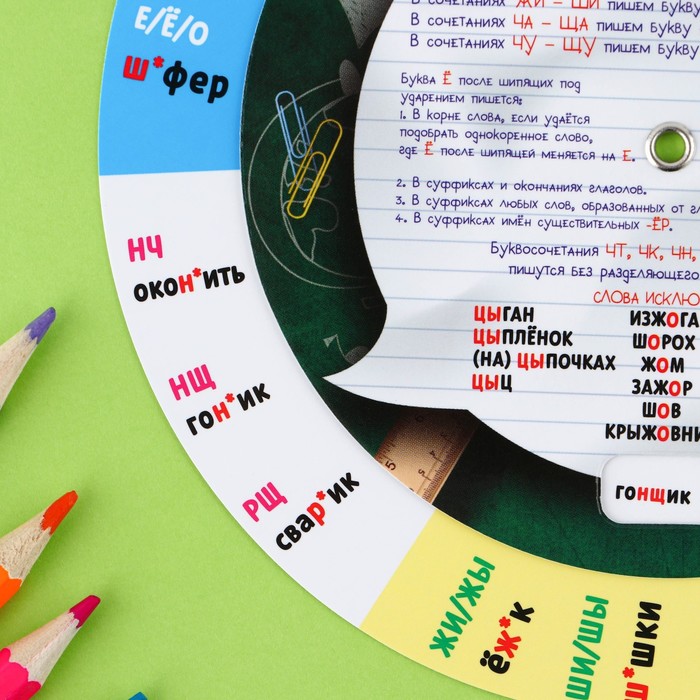 На вращающейся части находится окошко, с помощью которого нужно выбрать слово с сочетанием букв, правило написания которого вы хотите повторить. Когда вы определитесь со словом, белая стрелочка укажет вам на правило написания необходимого буквосочетания.