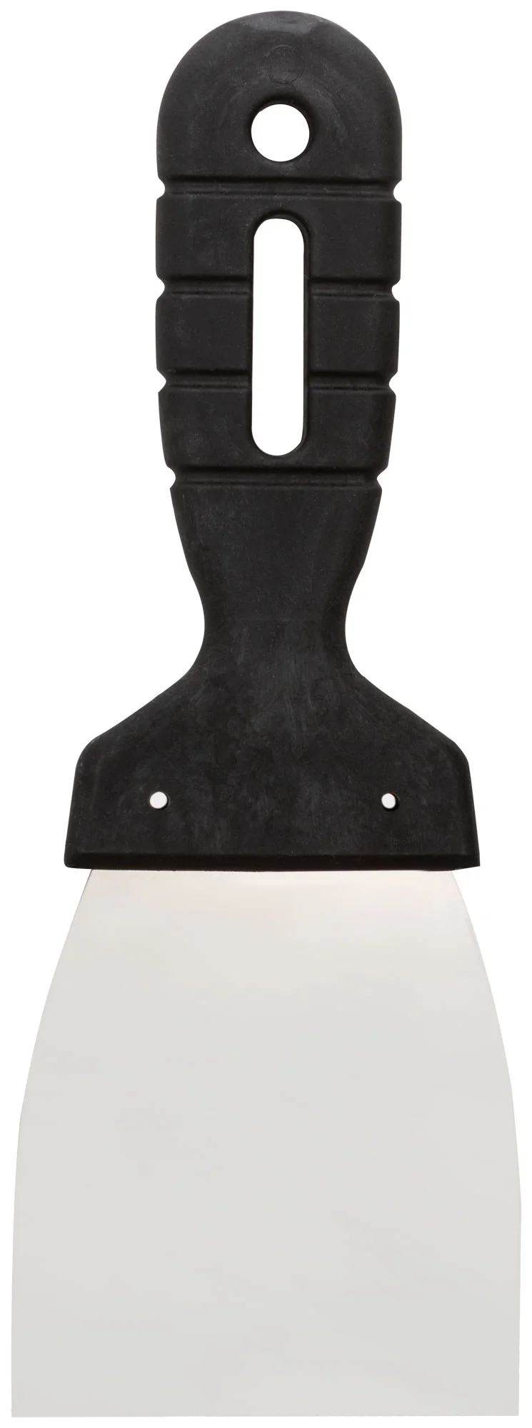 Шпатель изготовлен из нержавеющей стали, что обеспечивает долговечность и устойчивость к коррозии. Пластиковая ручка эргономичной формы позволяет удобно держать инструмент в руках, снижая усталость при длительных работах.