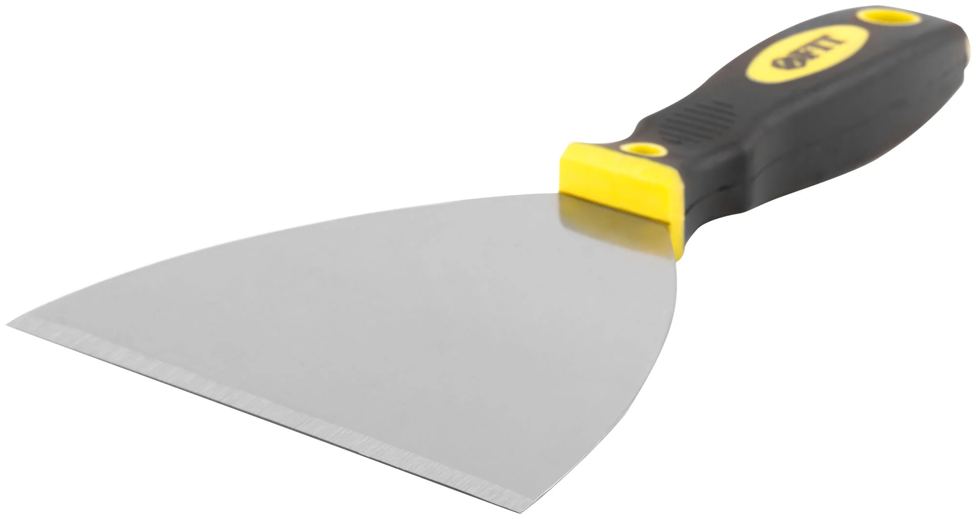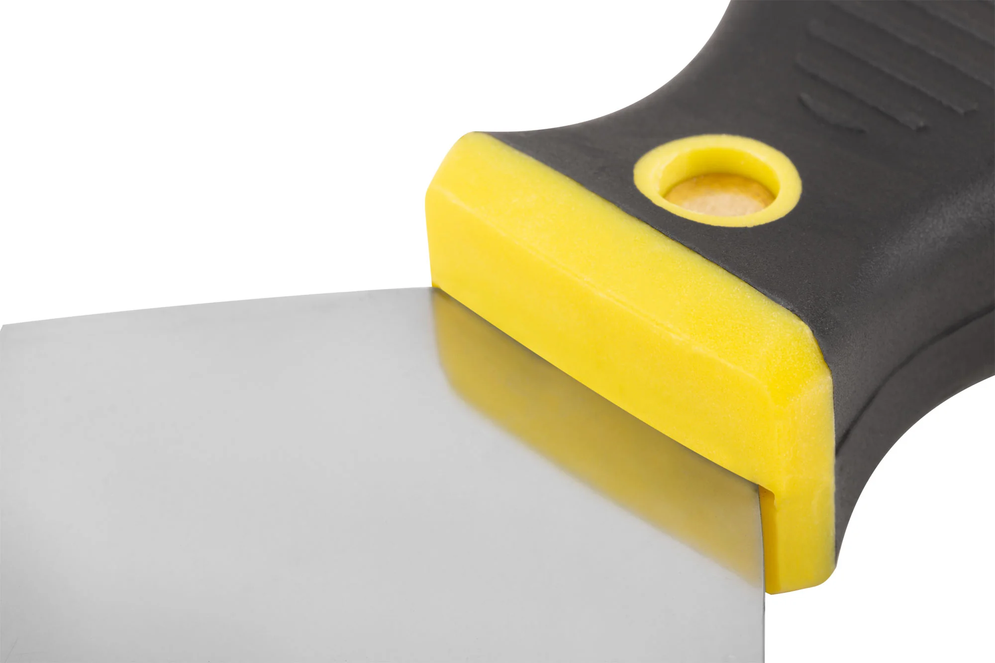 Изготовлен из полированной усиленной стали с твёрдостью HRC 72-78, этот шпатель гарантирует долговечность и устойчивость к износу. Двухкомпонентная ручка обеспечивает комфортное удержание, а металлический бойок позволяет использовать шпатель в качестве молотка.