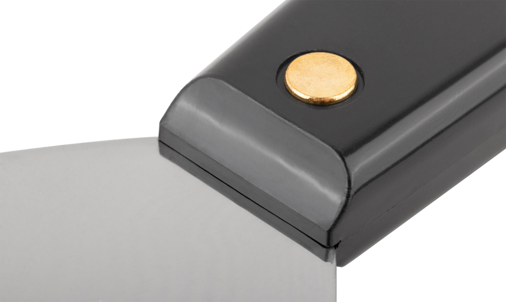 Лезвие шпателя изготовлено из твердой полированной стали с показателем твердости HRC 72-78 и толщиной 1 мм, что обеспечивает надежность и долговечность в использовании. Пластиковая ручка с металлическим бойком способствует удобному захвату и дополнительной устойчивости при работе.