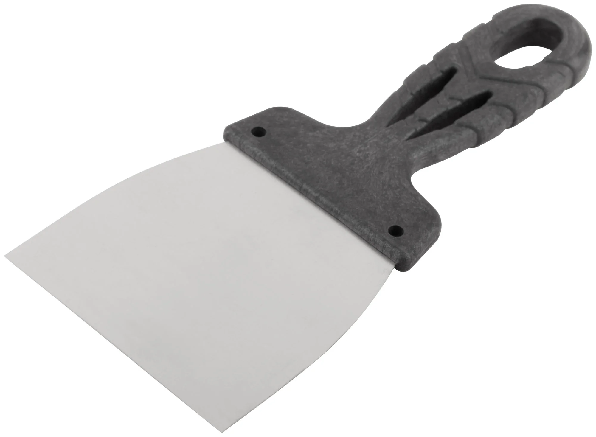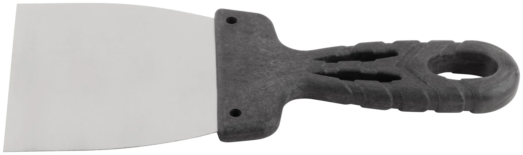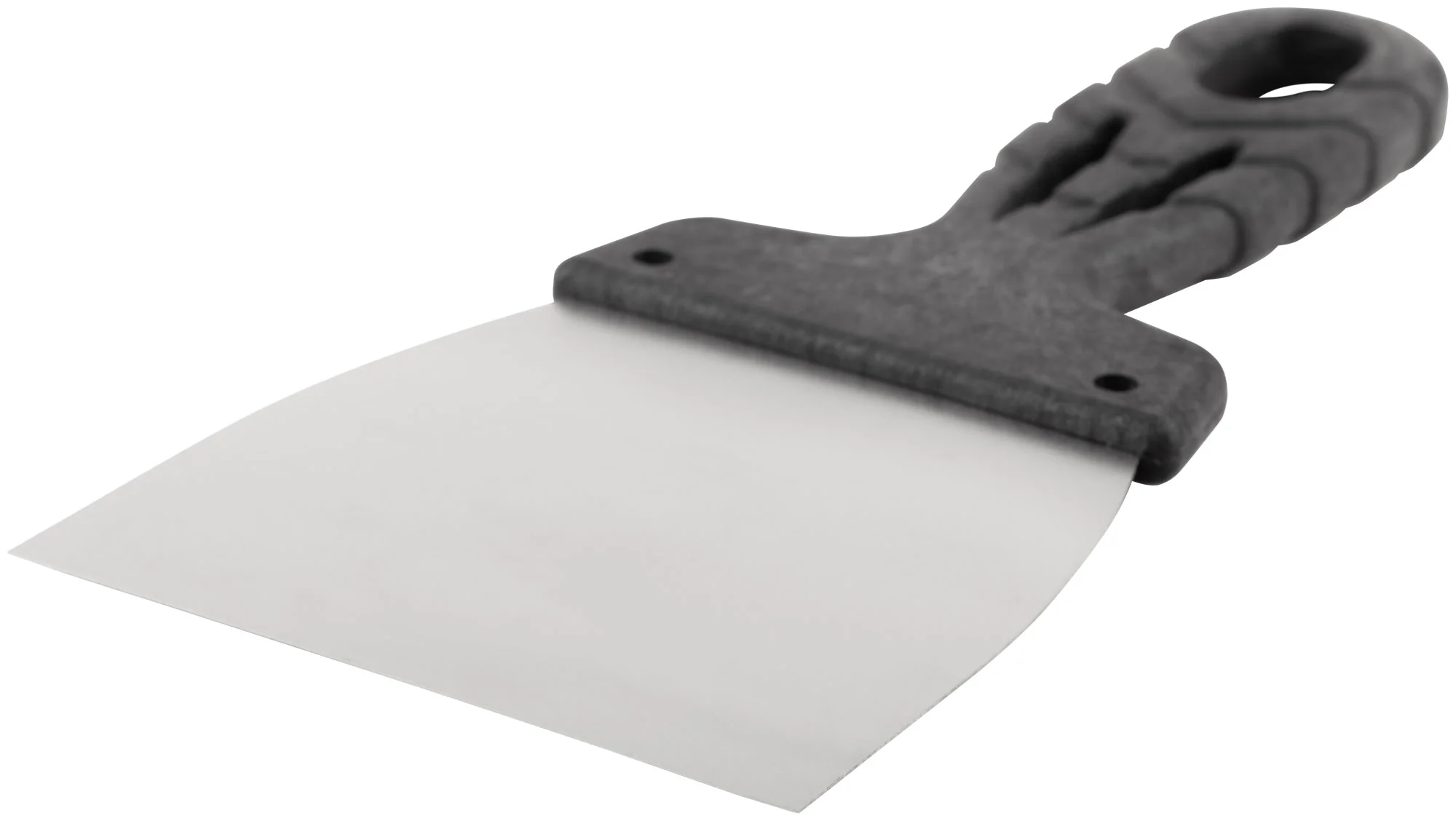Шпатель выполнен из нержавеющей стали, что обеспечивает его долговечность и устойчивость к коррозии. Удобная пластиковая ручка позволяет комфортно держать инструмент в руке, снижая усталость при длительной работе.