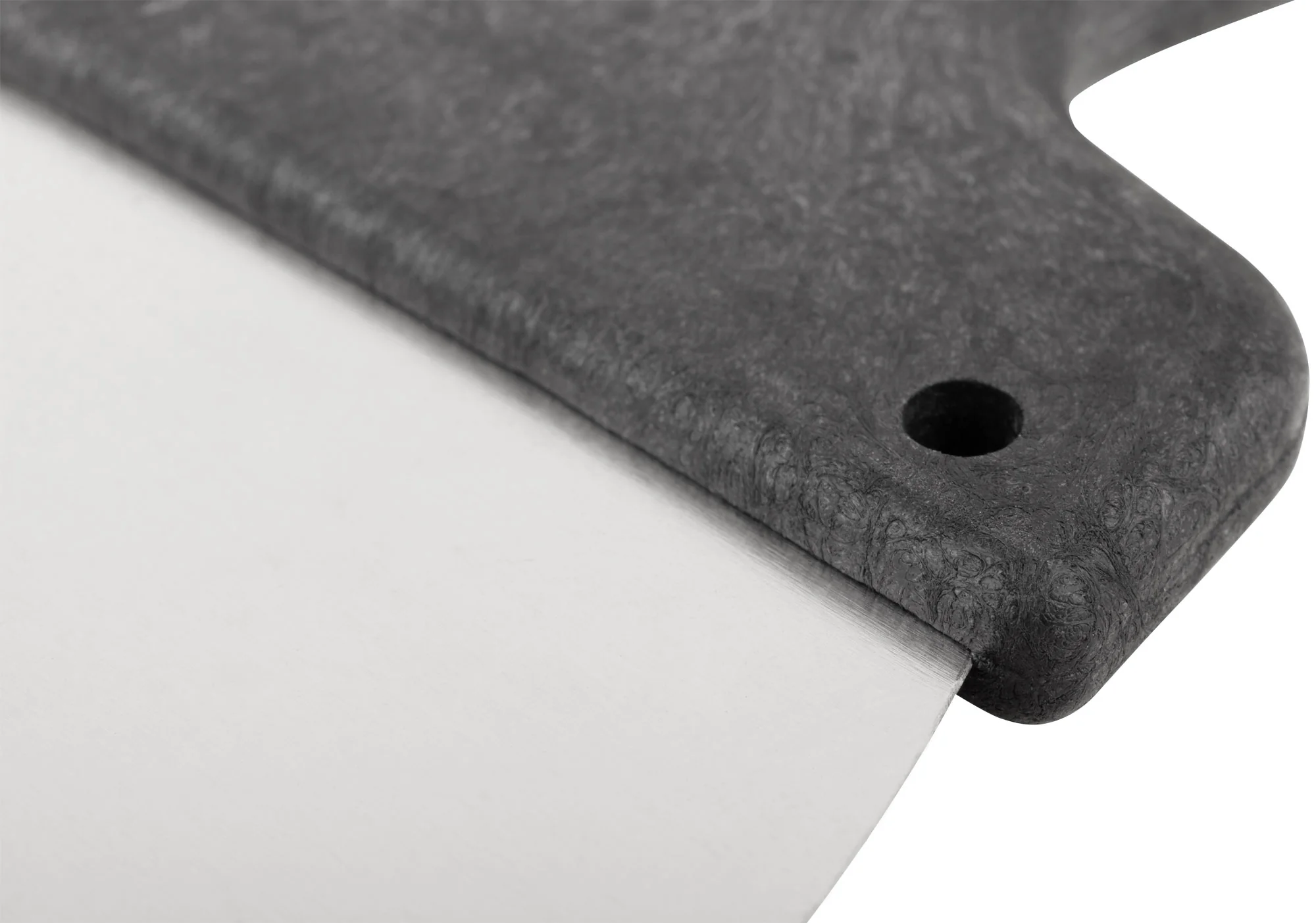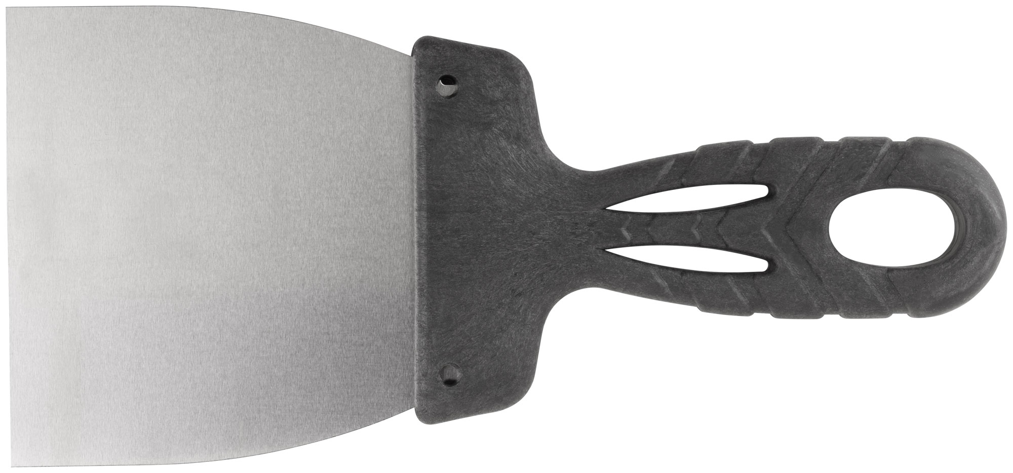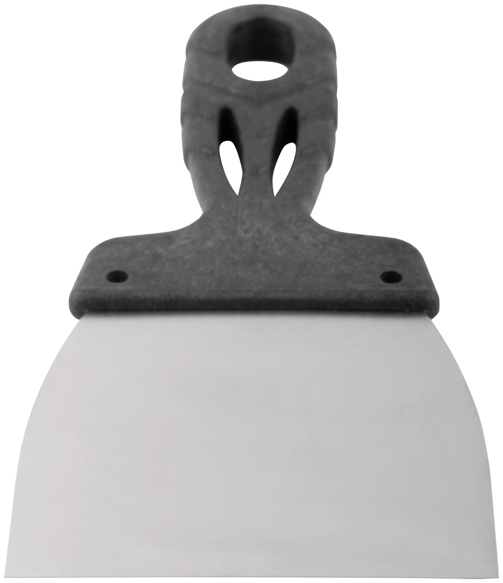 Шпатель выполнен из нержавеющей стали, что обеспечивает его долговечность и устойчивость к коррозии. Удобная пластиковая ручка позволяет комфортно держать инструмент в руке, снижая усталость при длительной работе.