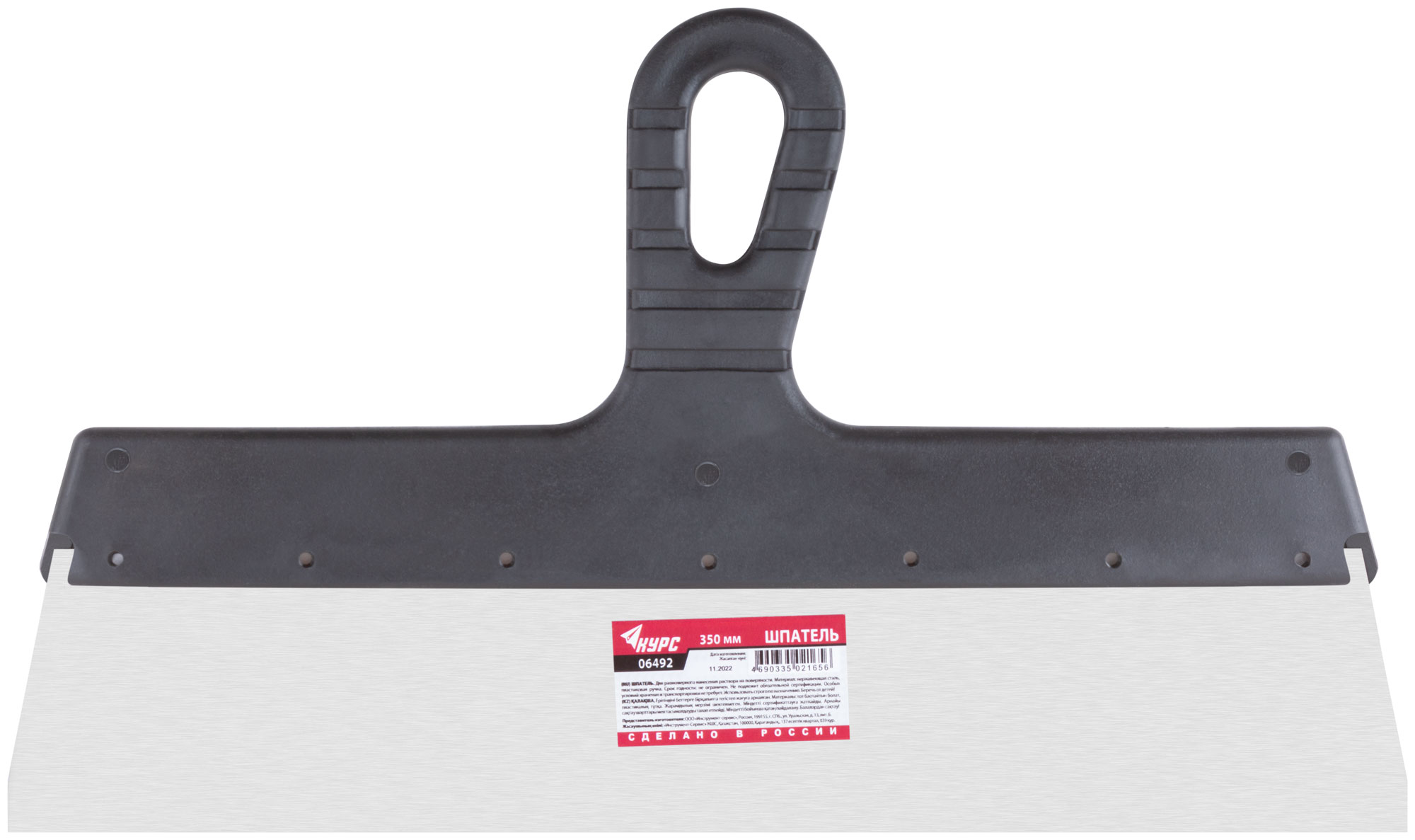 Удобная конструкция шпателя включает полотно из нержавеющей стали и пластиковую ручку, что делает его долговечным и устойчивым к коррозии. Размеры шпателя 350x195x10 мм, что оптимально для работы на больших площадях.