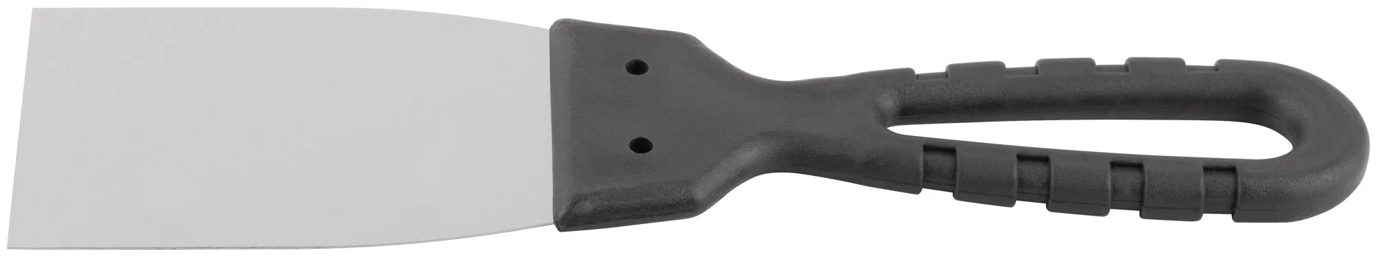 Основные преимущества этого шпателя — это его прочность и легкость в обращении. Нержавеющая сталь гарантирует долговечность, а пластиковая ручка снижает усталость при работе.