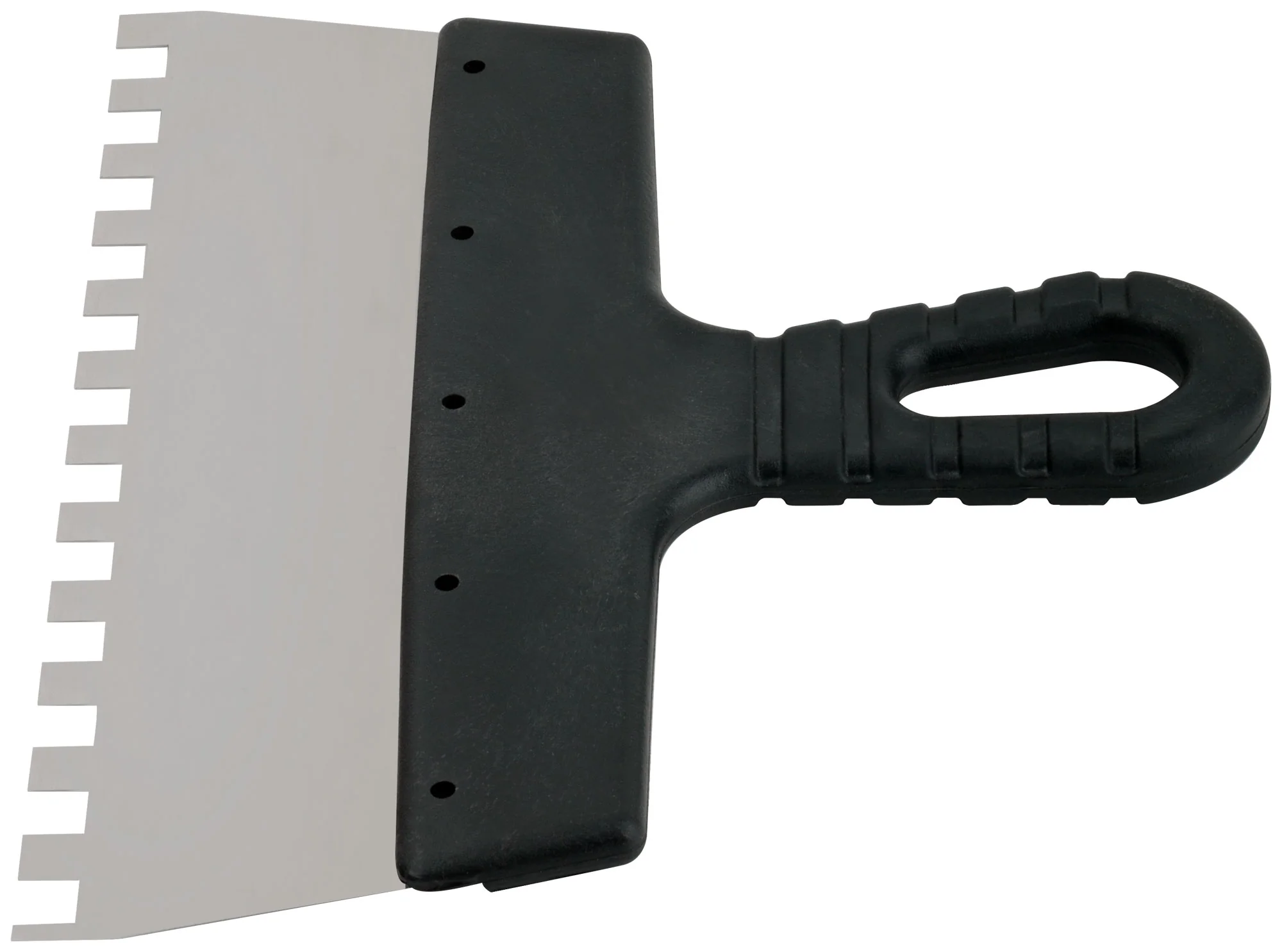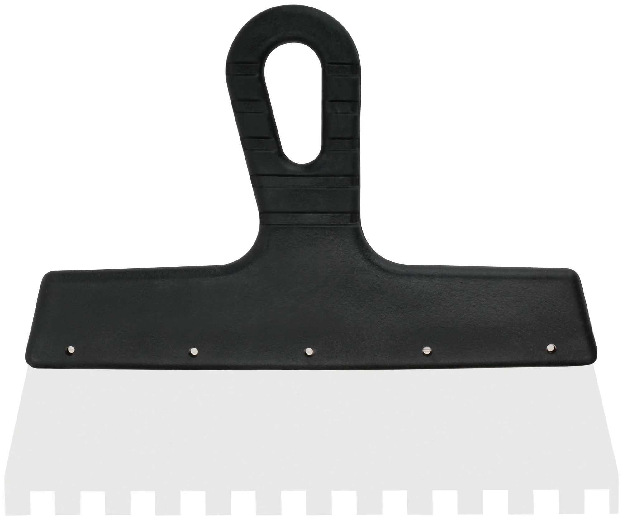 Идеален для нанесения шпаклёвки и клеевых составов на большие поверхности. Благодаря зубчатой форме шириной 250 мм и высотой зуба 10 мм, позволяет равномерно распределять материал, обеспечивая качественное сцепление с основанием.