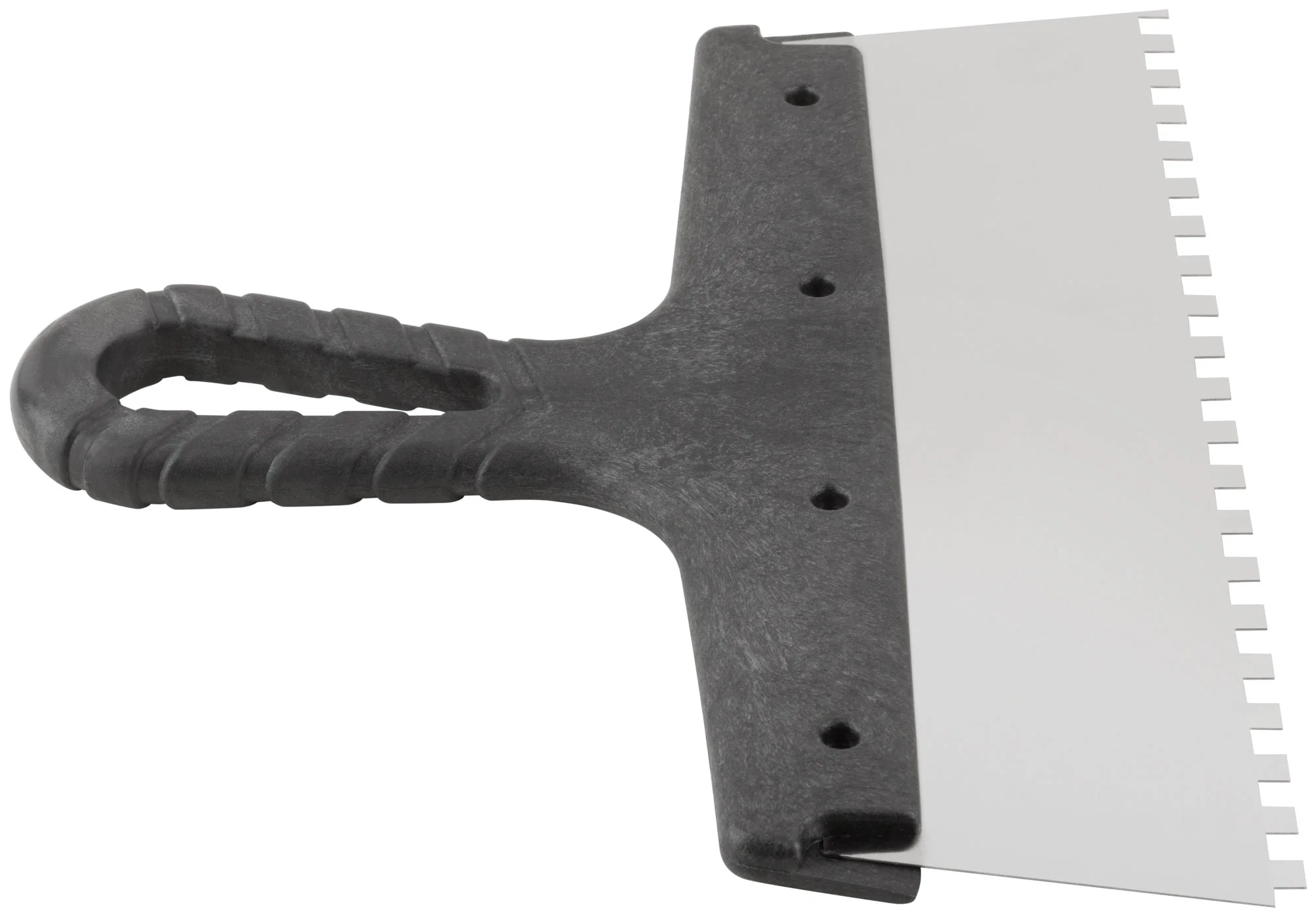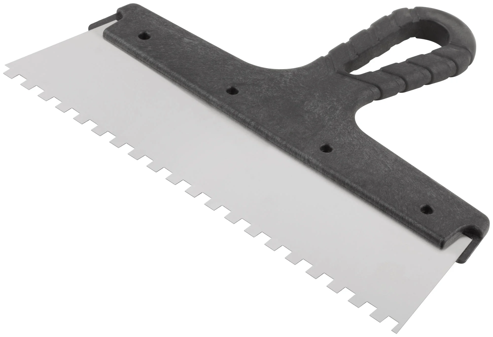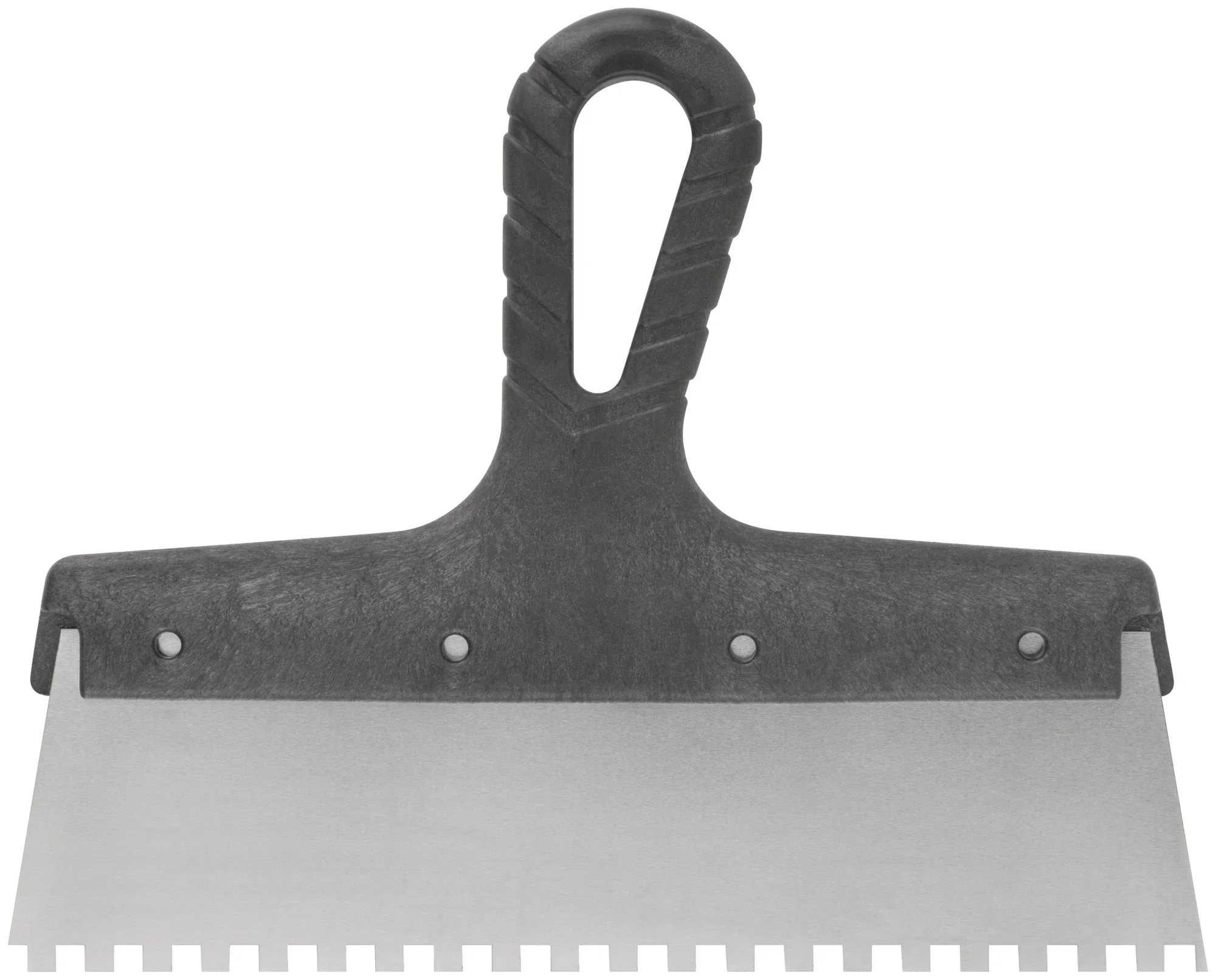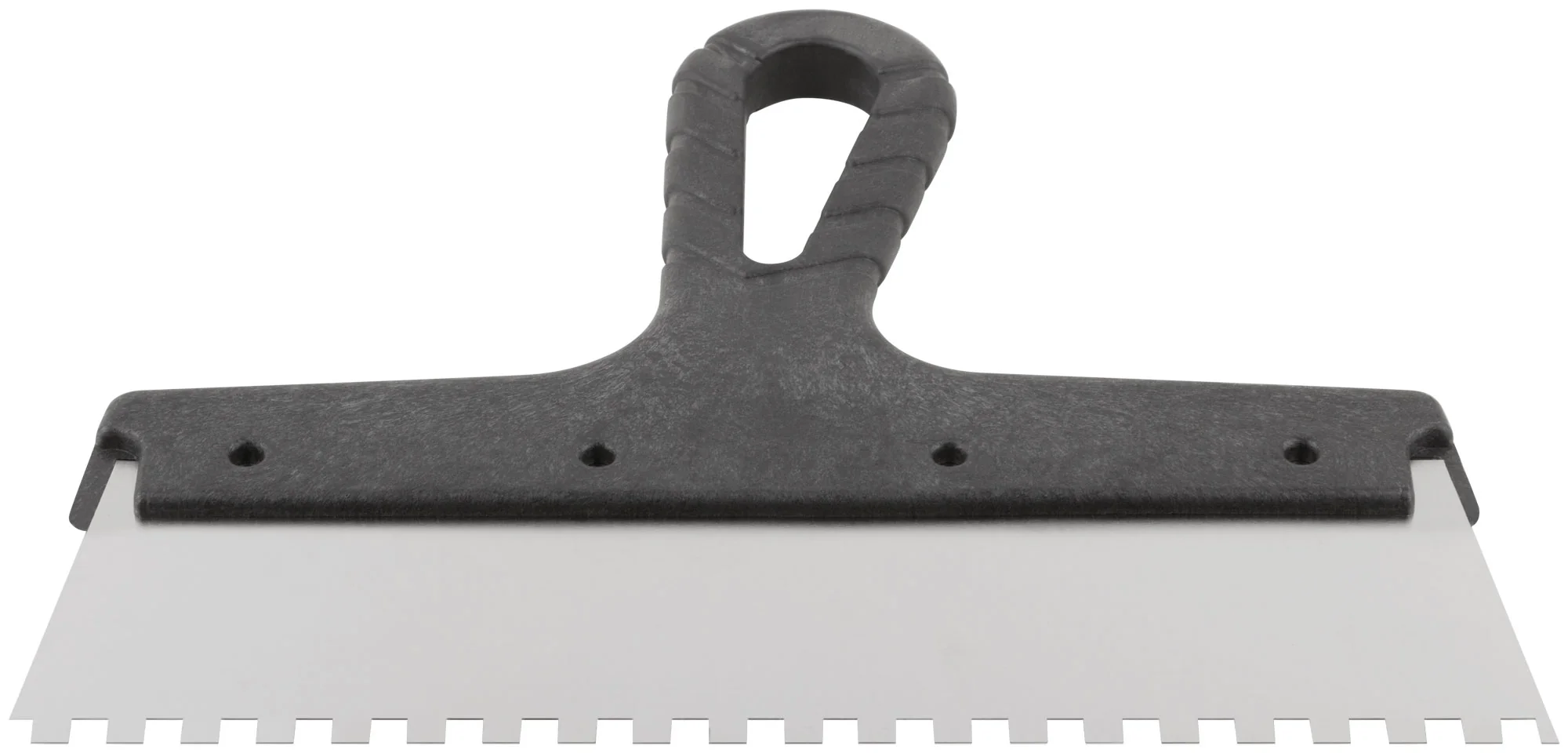 Идеально подходит для нанесения клея или раствора при облицовке фасадов и других поверхностей большой площади. Зубчатый дизайн обеспечивает равномерное распределение материала, что позволяет минимизировать перерасход и улучшить адгезию.