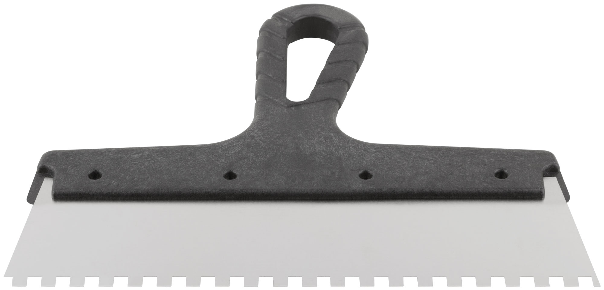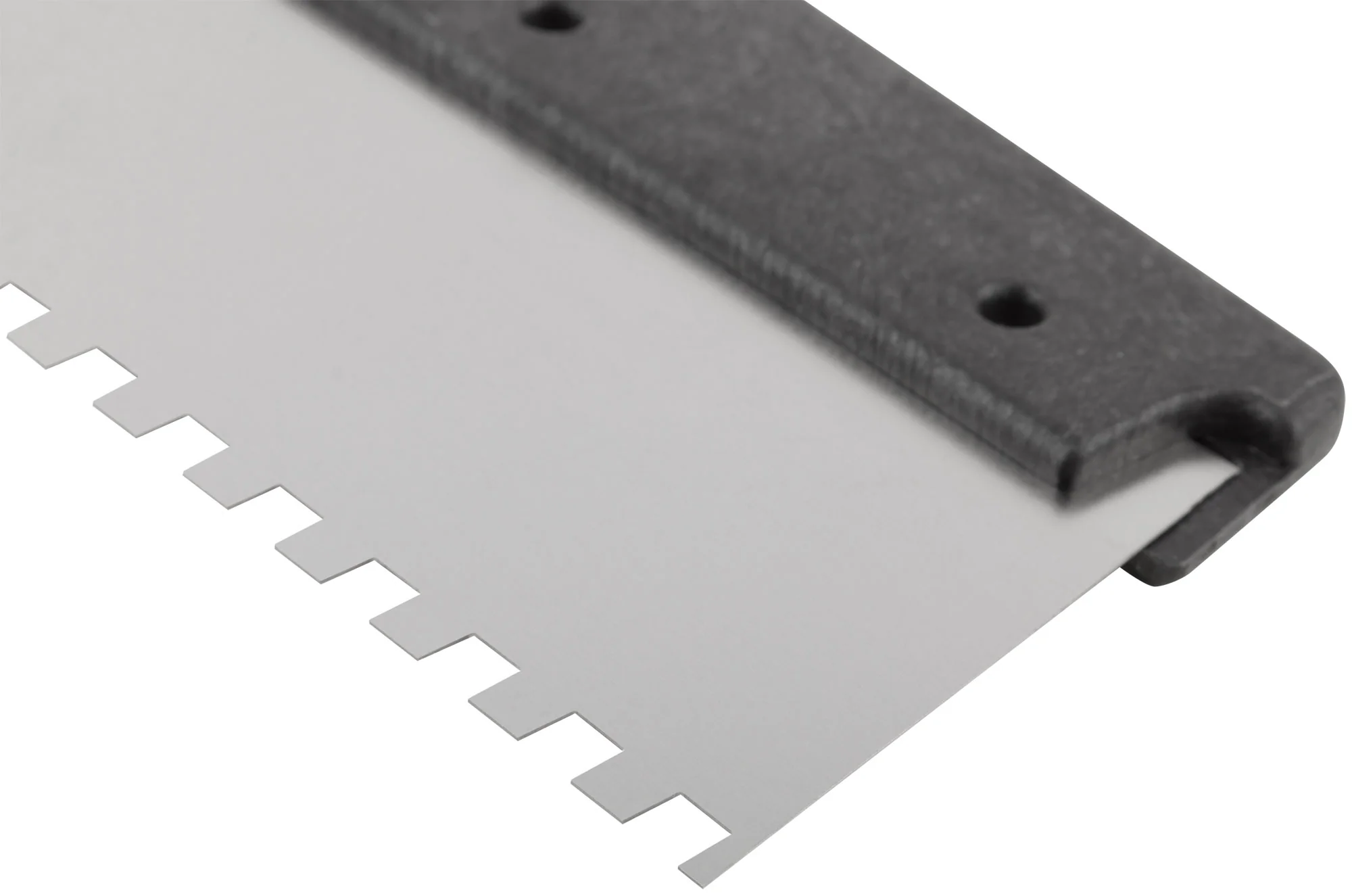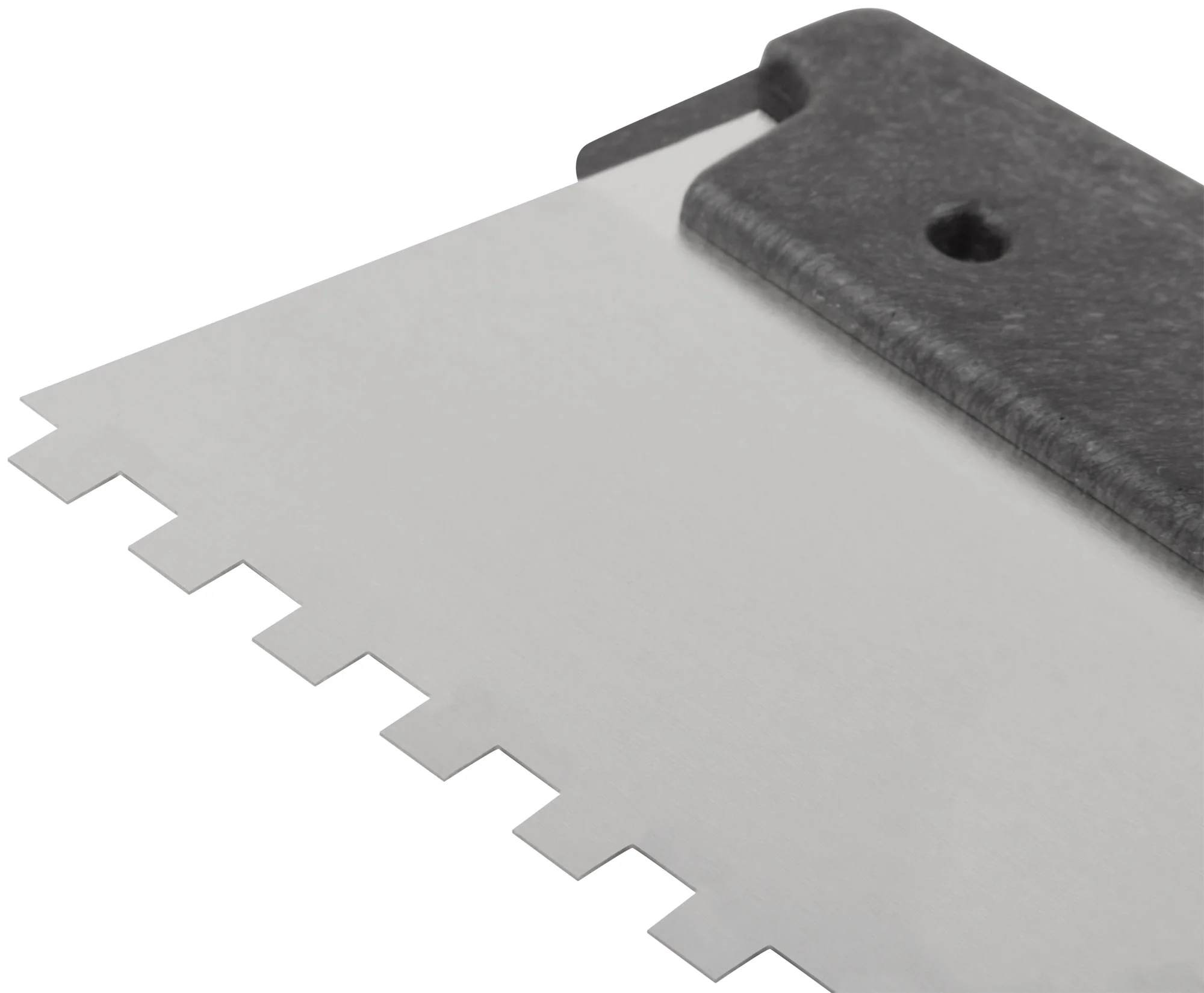 Преимущество данного шпателя в его надежности и долговечности благодаря применению нержавеющей стали. Зубчатая кромка позволяет точно контролировать количество наносимого материала и обеспечивает ровное покрытие.