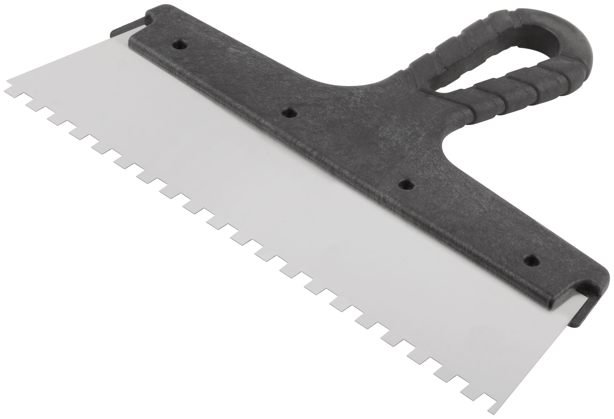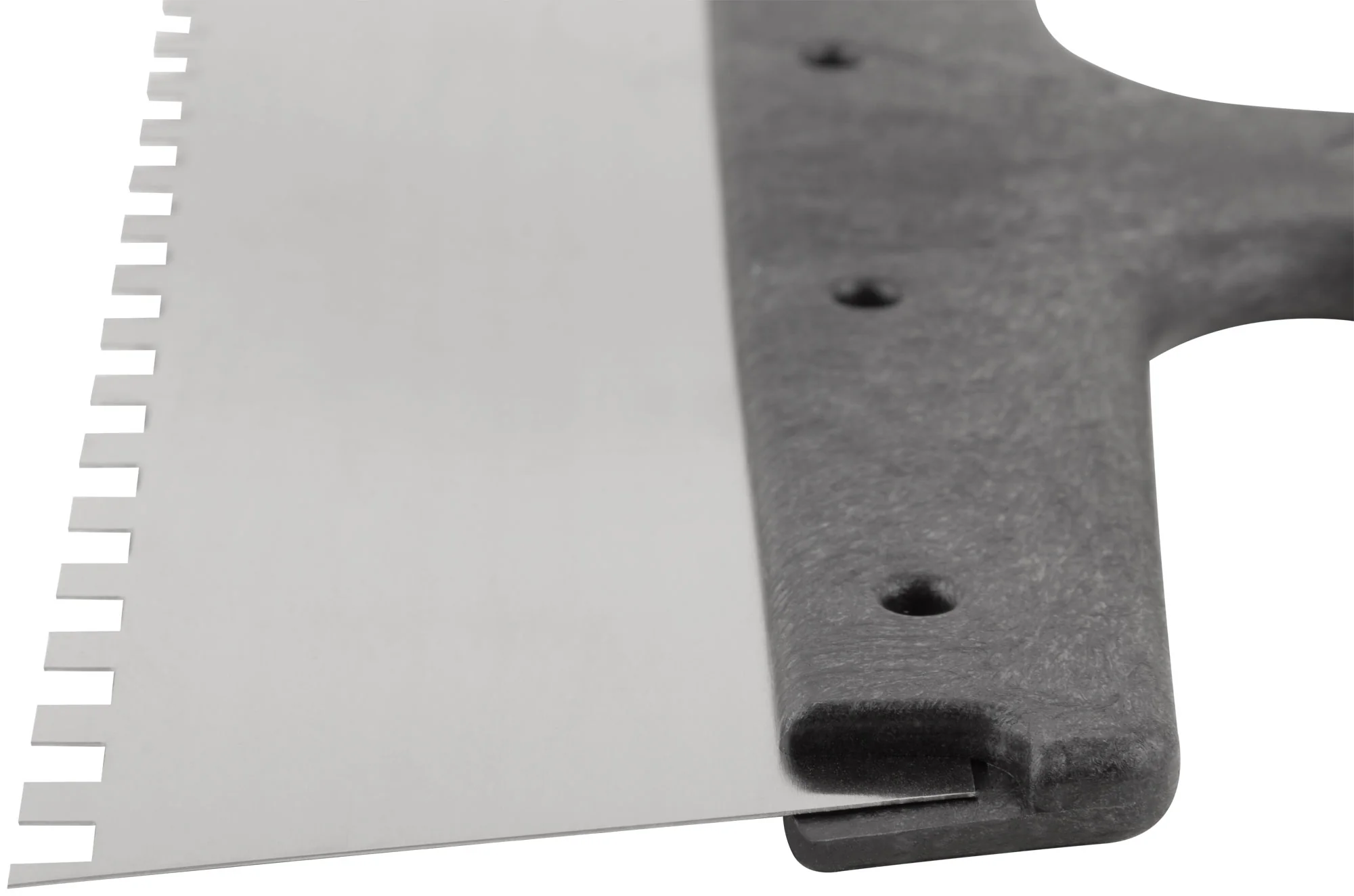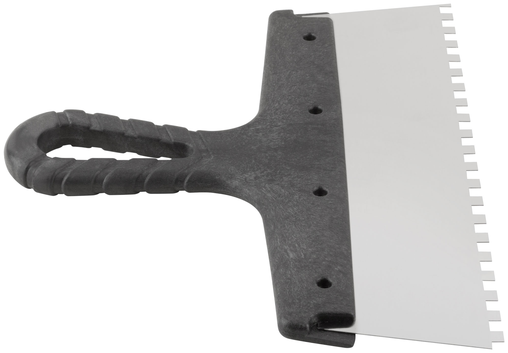 Преимущество данного шпателя в его надежности и долговечности благодаря применению нержавеющей стали. Зубчатая кромка позволяет точно контролировать количество наносимого материала и обеспечивает ровное покрытие.