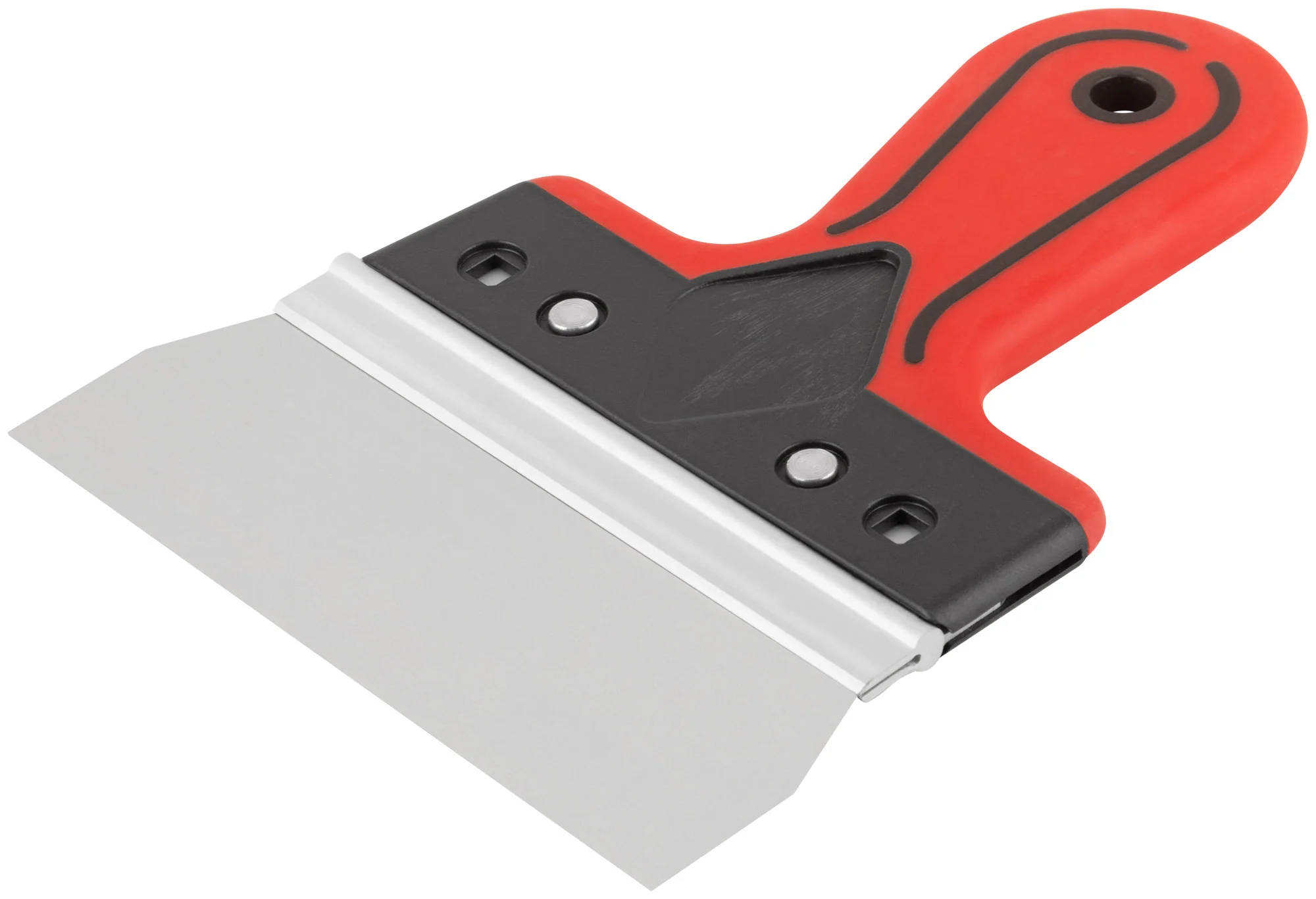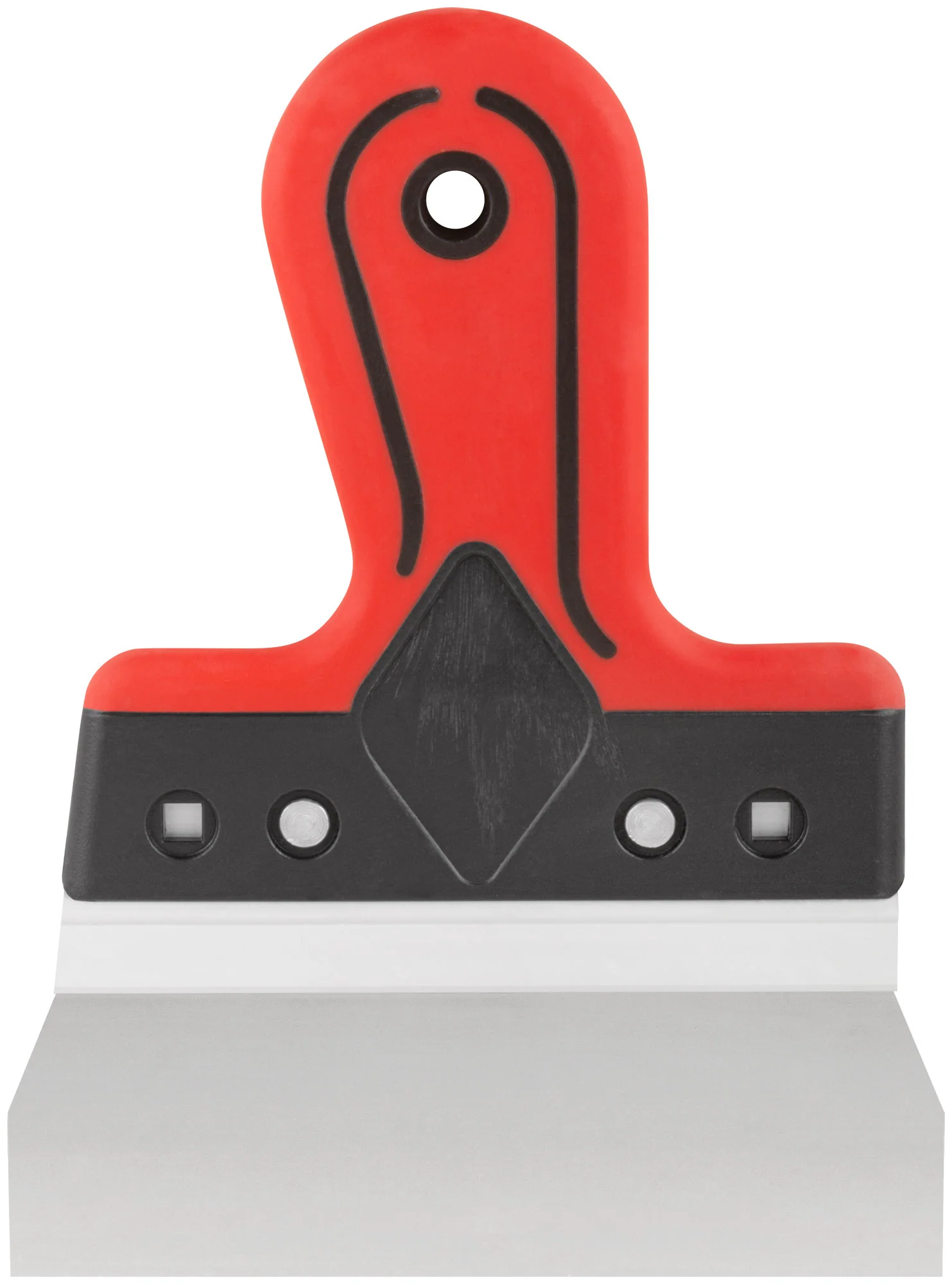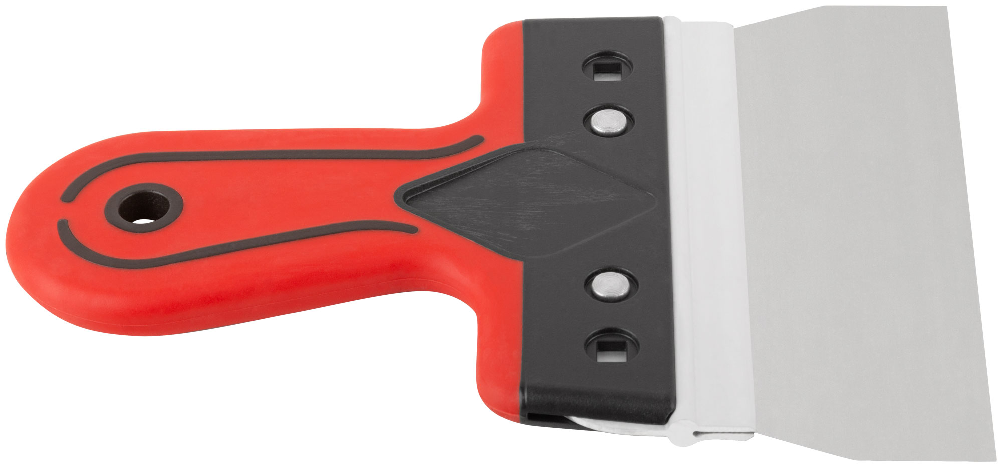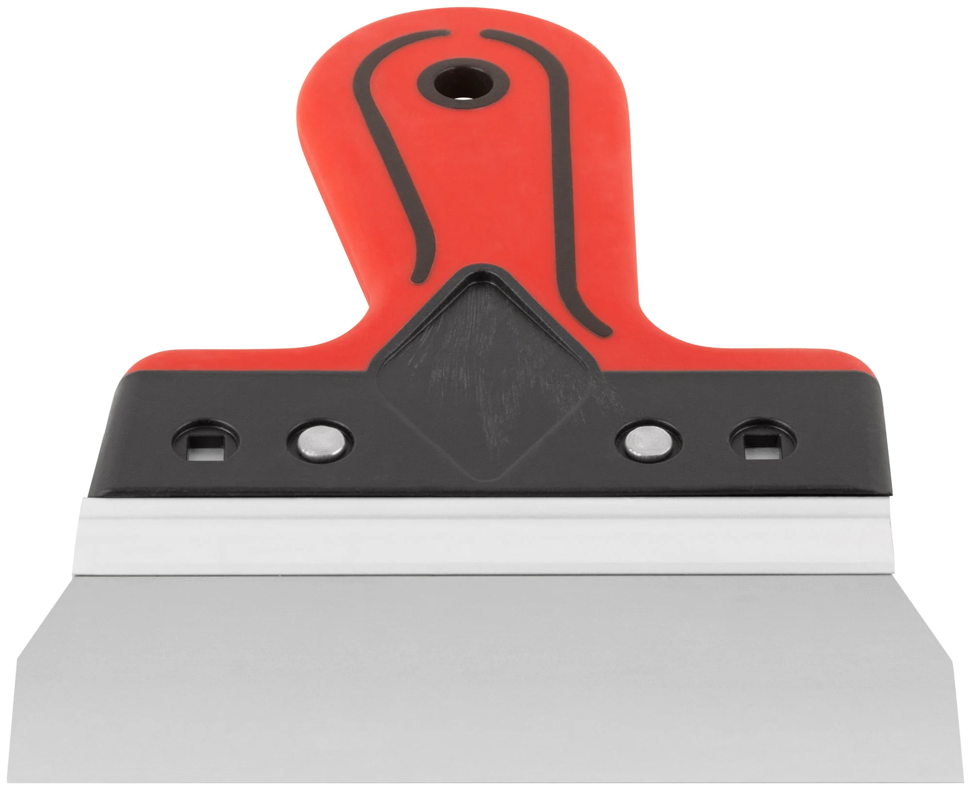 Изготовлен из нержавеющей стали, лезвие шпателя обладает высокой прочностью и устойчивостью к коррозии. Алюминиевое ребро жесткости предотвращает деформацию инструмента, а прорезиненная пластиковая ручка обеспечивает комфортное и надежное удержание в процессе работы.