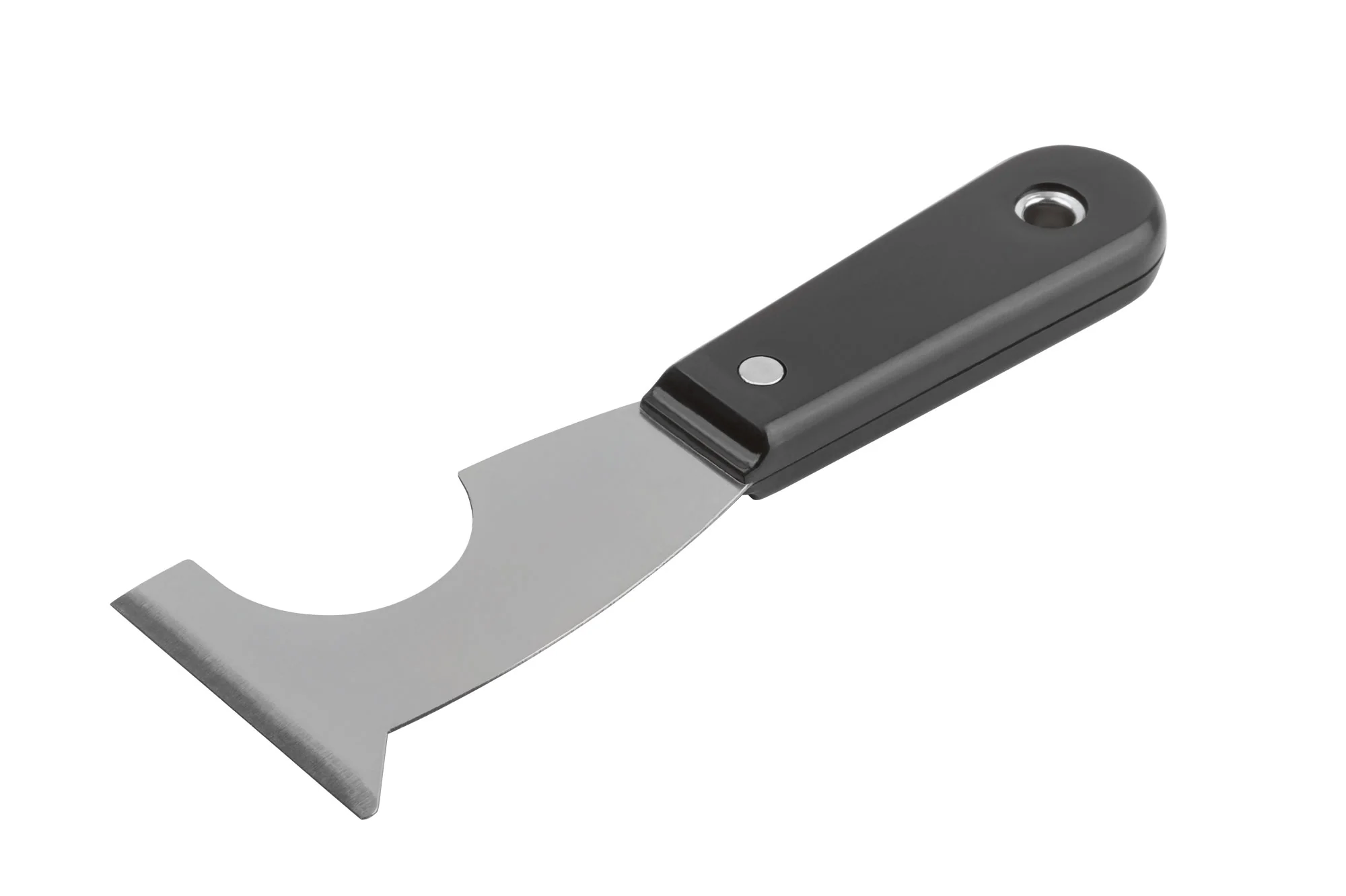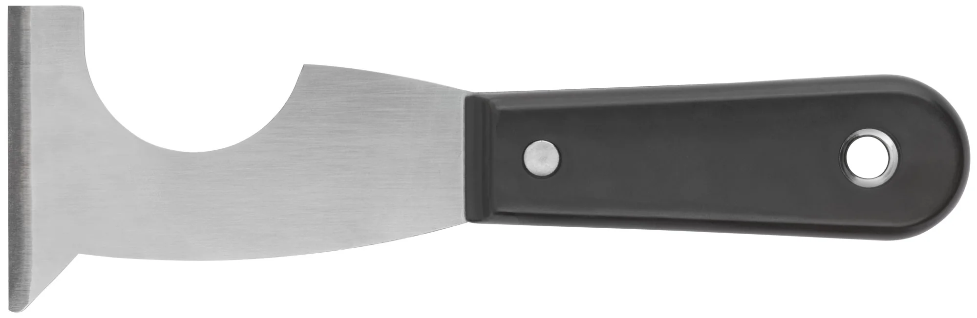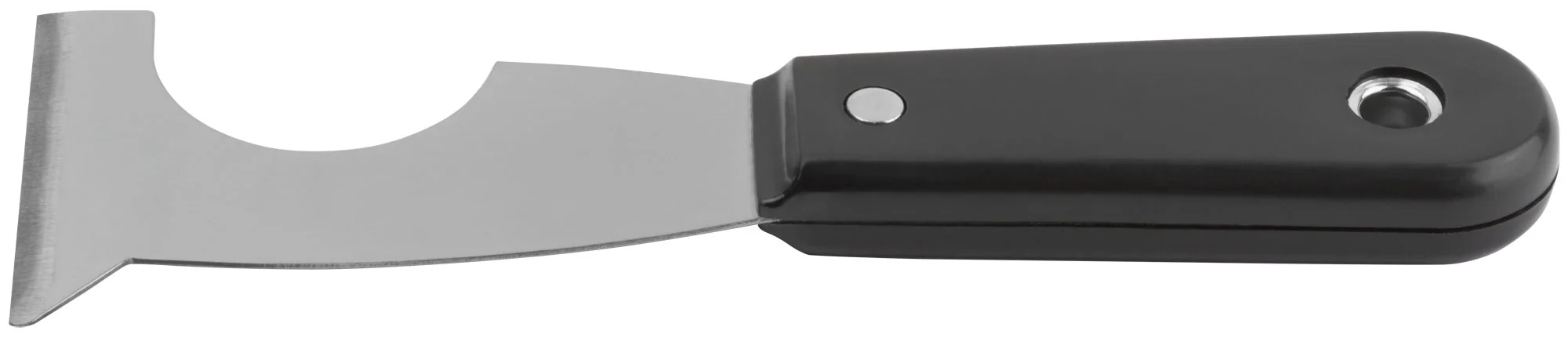 Лезвие шпателя выполнено из инструментальной стали и имеет заточенную грань, что позволяет эффективно работать с различными материалами. Удобная пластиковая ручка облегчает долгую работу и снижает утомляемость.
