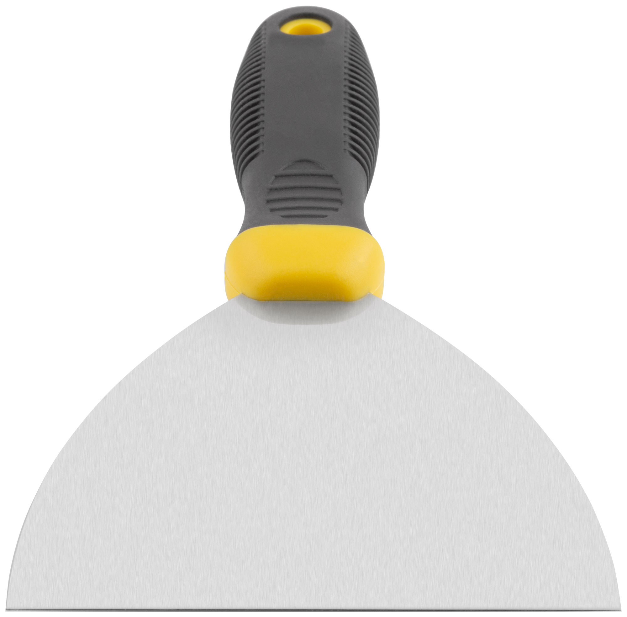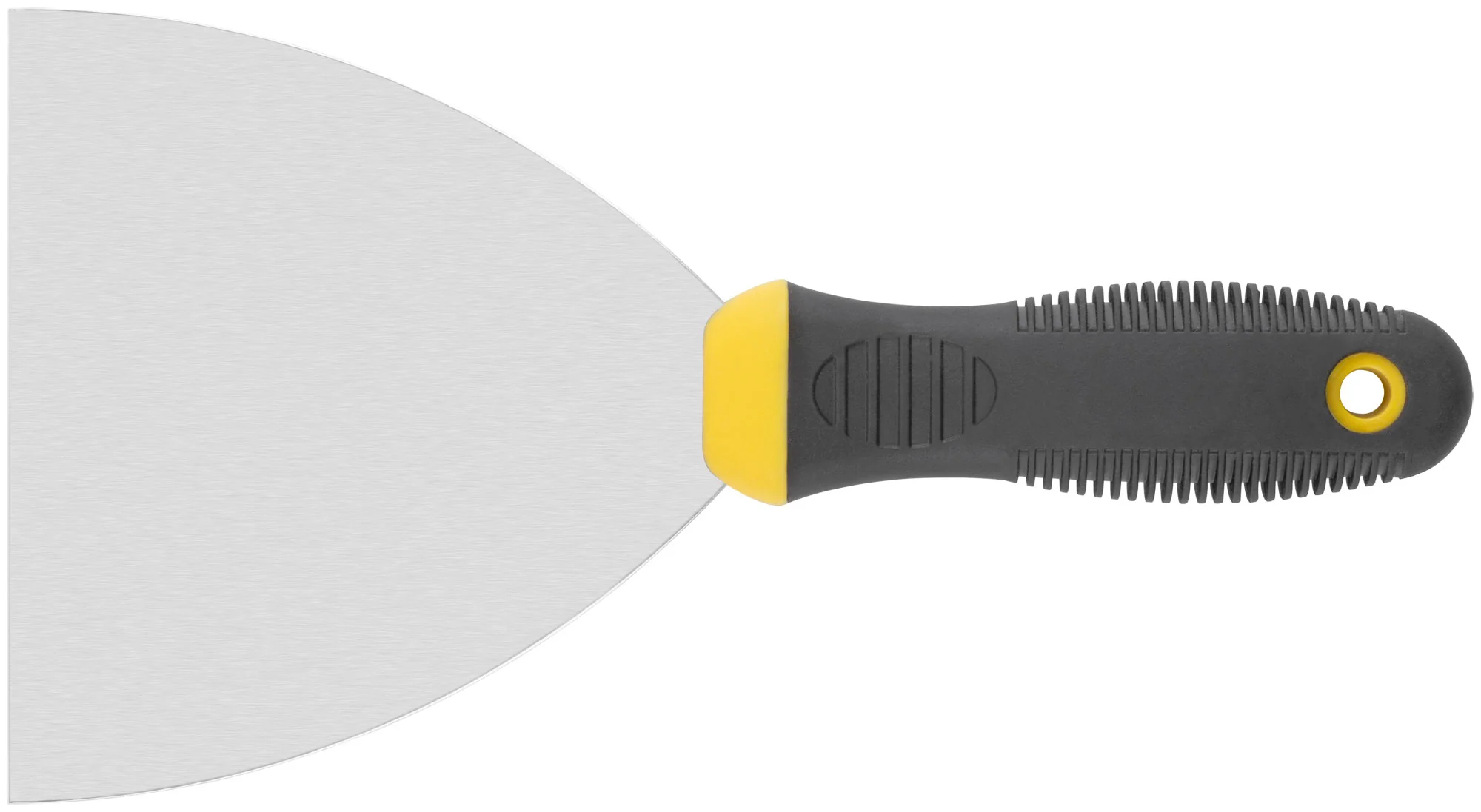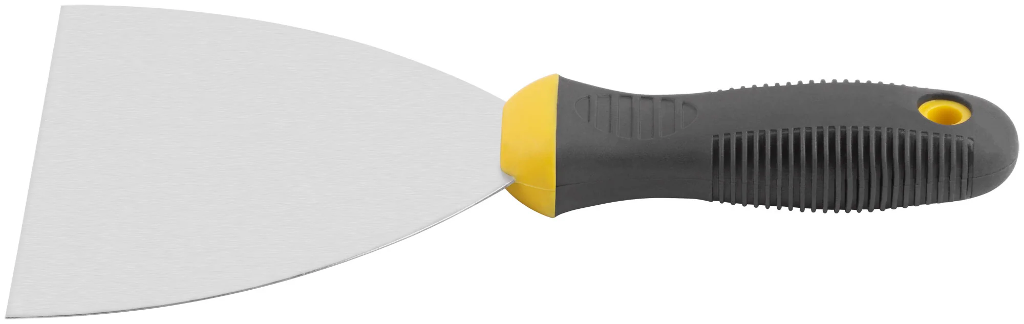 Полотно шпателя изготовлено из нержавеющей стали, что обеспечивает долговечность и устойчивость к коррозии. Прорезиненная ручка обеспечивает удобный и надежный захват, предотвращая скольжение даже при влажных условиях работы.