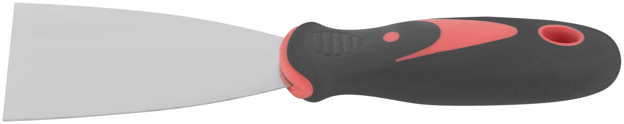 Шпатель выполнен из прочной нержавеющей стали, что гарантирует долговечность и устойчивость к коррозии. Прорезиненная ручка обеспечивает комфортный захват, снижая усталость при длительной работе.