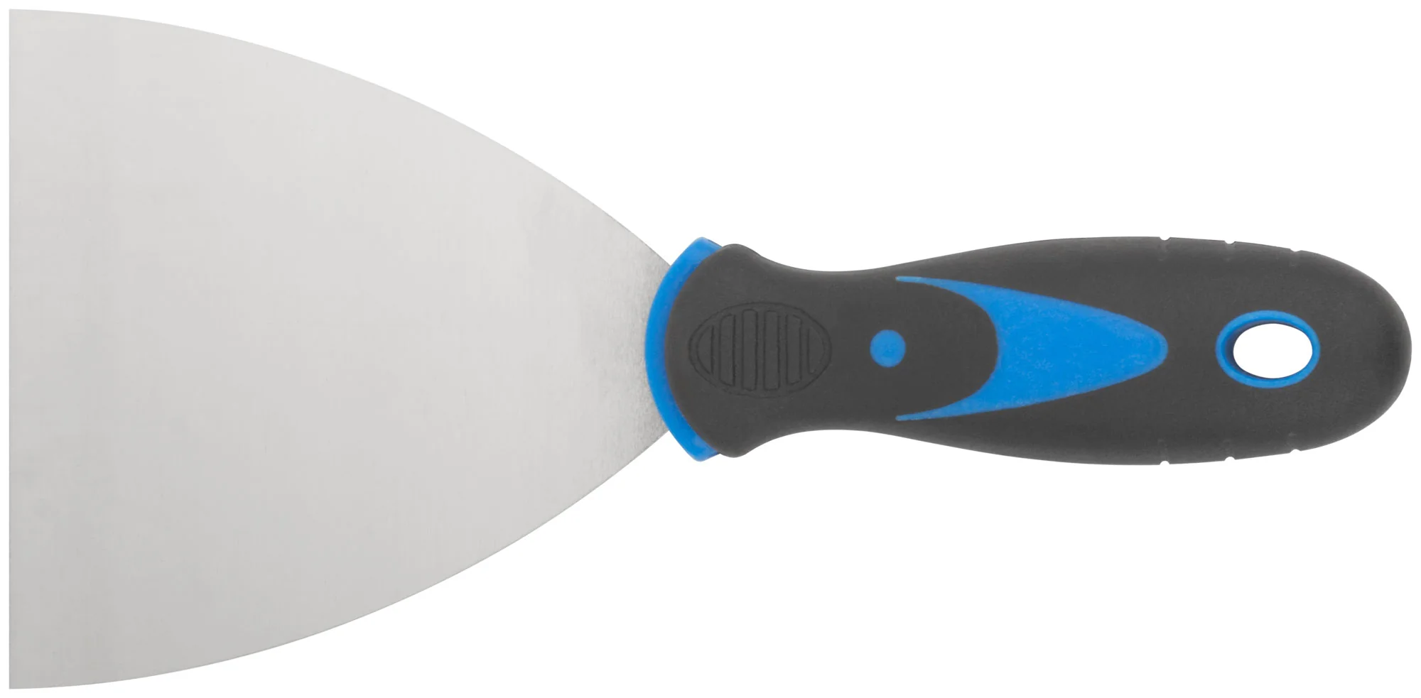Изготовленный из нержавеющей стали, шпатель отличается долговечностью и устойчивостью к коррозии. Пластиковая прорезиненная ручка удобно ложится в руку, снижая усталость при длительной работе. Габариты инструмента составляют 210x100x25 мм, что делает его компактным и простым в хранении.