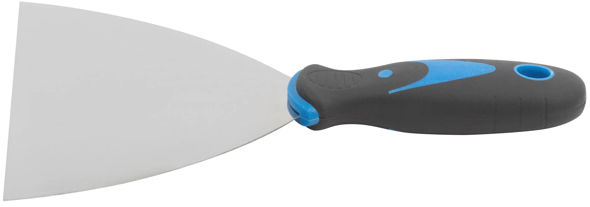 Шпатель оборудован комбинированной пластиковой и прорезиненной ручкой, которая обеспечивает удобный хват и снижает усталость рук при длительном использовании. Ширина лезвия 150 мм позволяет эффективно работать на больших поверхностях.