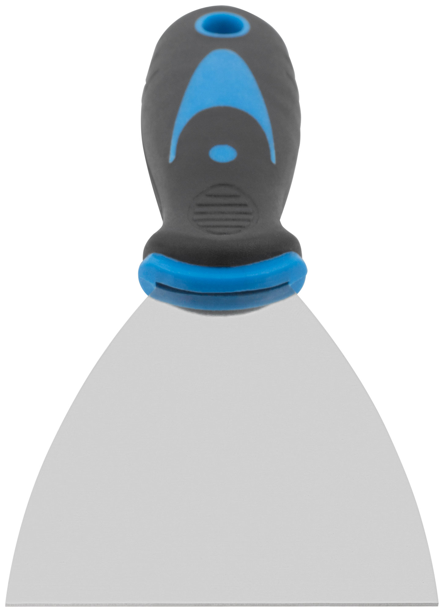 Шпатель изготовлен из нержавеющей стали, что обеспечивает долговечность и устойчивость к коррозии. Комбинированная ручка из пластика с прорезиненной поверхностью гарантирует удобный и надежный захват, снижая усталость при длительной работе.