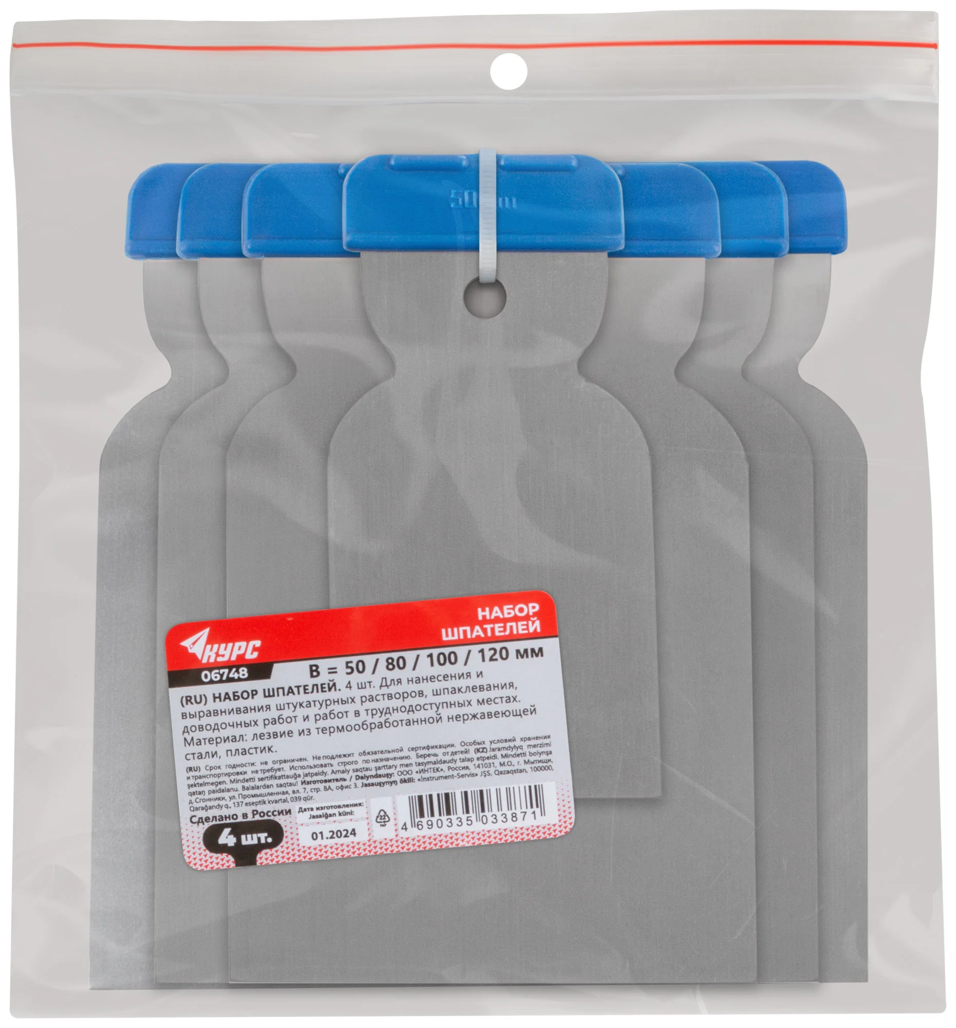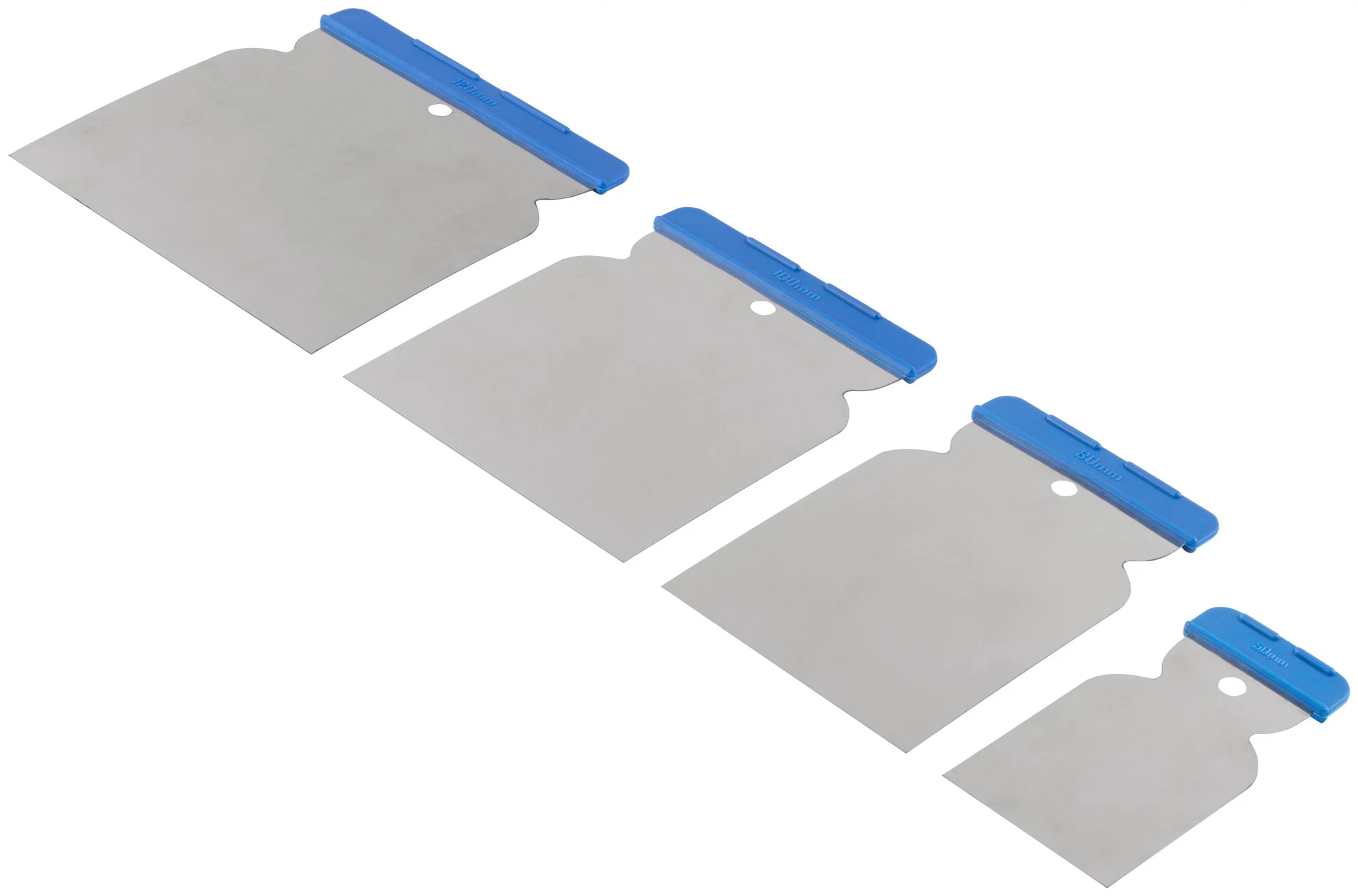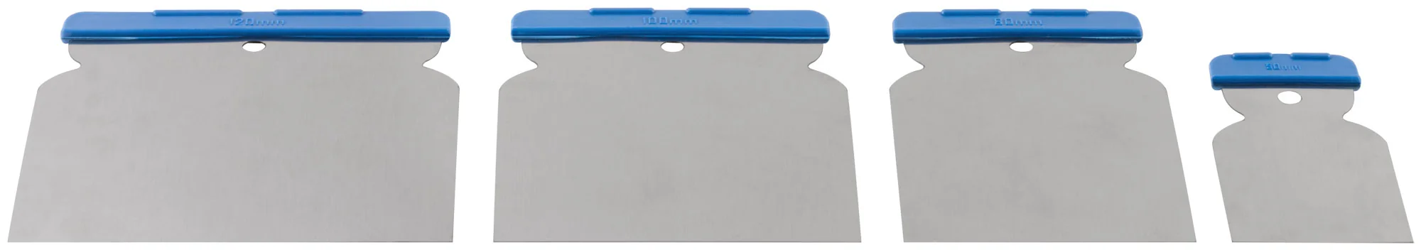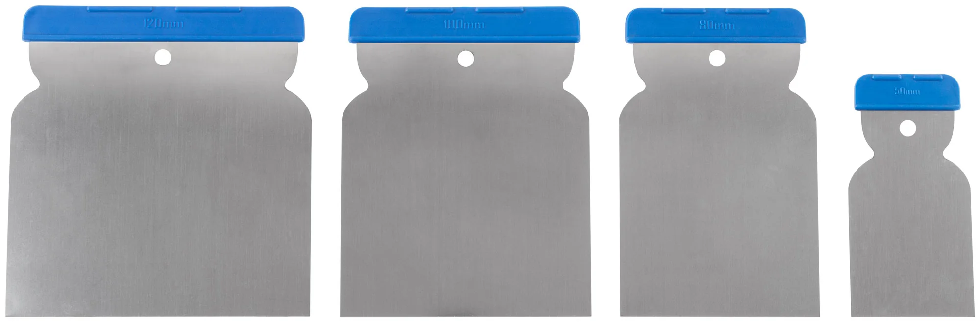 Преимущество этого набора заключается в разнообразии размеров шпателей — 50, 80, 100 и 120 мм, что дает возможность выбрать оптимальный инструмент для различных задач. Легкий вес и компактные размеры способствуют удобной транспортировке и хранению.