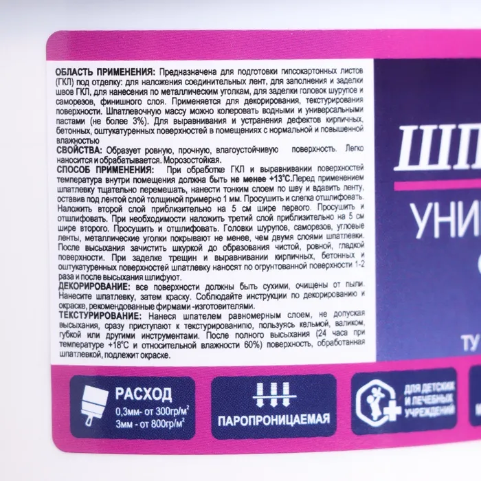 - Область применения: предназначена для подготовки гипсокартонных листов (ГКЛ) под отделку: для наложения соединительных лент, для заполнения и заделки швов ГКЛ, для нанесения по металлическим уголкам, для заделки головок шурупов или саморезов, финишного слоя