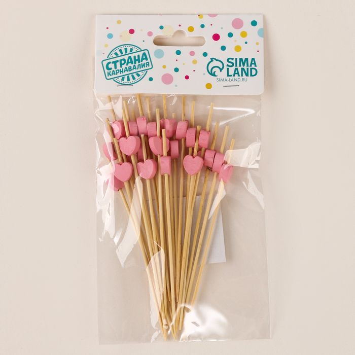 - Набор включает шпажки с оптимальной длиной, выполненные из дерева с декоративными элементами в виде сердечек.