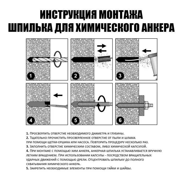Используется при проведении работ по соединению стен с перекрытием, устройству арматурных выпусков, установке временных опор. Шпилька даёт возможность монтировать конструкции на расстоянии от основания, не требуя при этом дополнительного бетонирования.