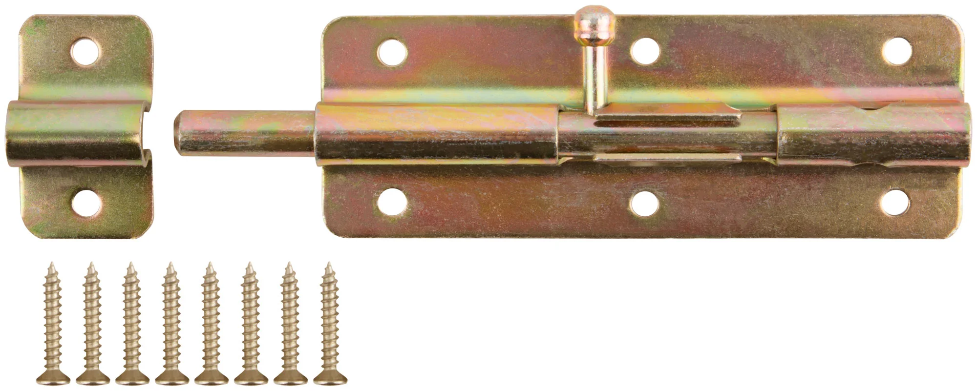 Изготовленный из инструментальной стали, шпингалет покрыт желтым цинком, что обеспечивает ему долговечность и устойчивость к коррозии. Конструкция накладного типа упрощает монтаж и не требует сложных инструментов.