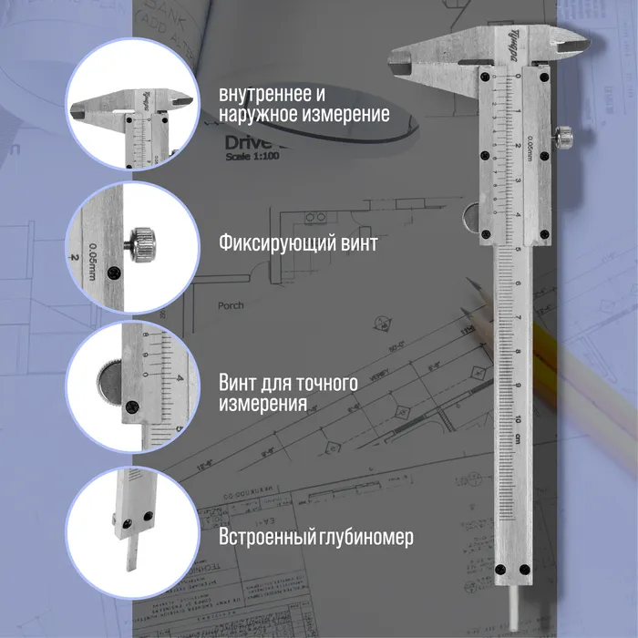 Штангенциркуль ТУНДРА, металлический, с глубиномером, цена деления 0.05 мм, 100 мм — Характеристики