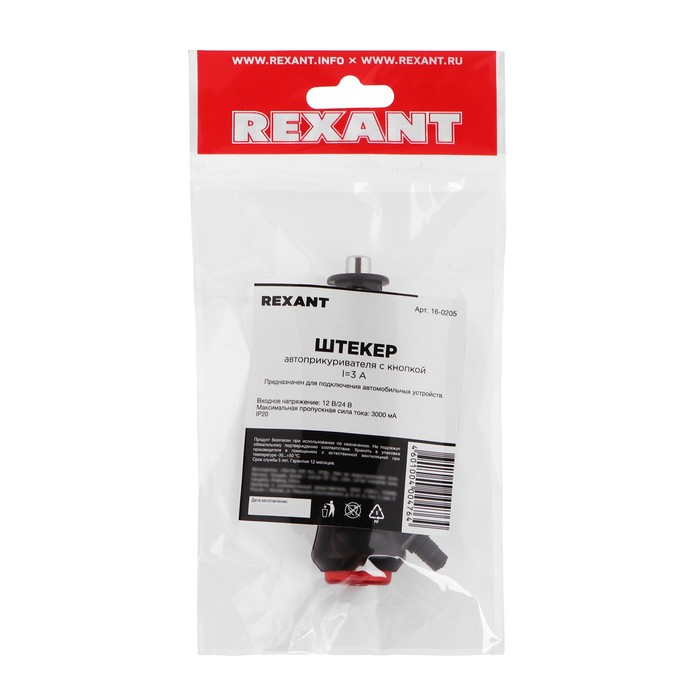 Штекер автоприкуривателя Rexant с кнопкой I=3А предназначен для подключения автомобильных устройств. Штекер позволит через розетку прикуривателя автомобиля передать напряжение 12B/24В на различные автомобильные устройства (преимущественно на радар-детекторы или видеорегистраторы). Корпус штекера изготовлен из термостойкого и прочного ABC-пластика и имеет LED-индикатор питания. Находящийся в корпусе предохранитель продлит жизнь вашего оборудования. Отличительной особенностью разъёма является наличие кнопки включения питания на два положения, поэтому для прекращения подачи тока на устройство достаточно всего лишь нажать красную кнопку. Автомобильный штекер прикуривателя Rexant обеспечит быстрое подключение к бортовой сети необходимых устройств.