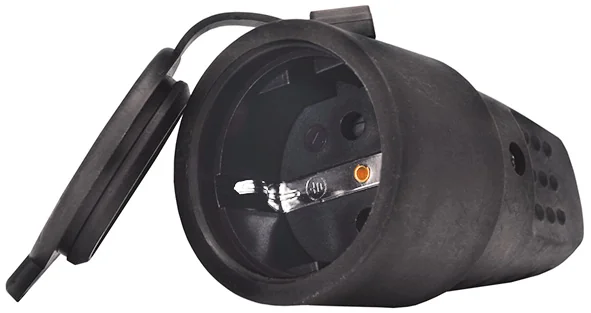 Корпус разъема выполнен из прочного каучука, что обеспечивает долговечность и устойчивость к внешним воздействиям. Его герметичность соответствует стандарту IP44, что гарантирует защиту от брызг и проникновения пыли. Разъем рассчитан на напряжение 220/250 В и номинальный ток 16 А, что позволяет использовать его с широким спектром оборудования.
