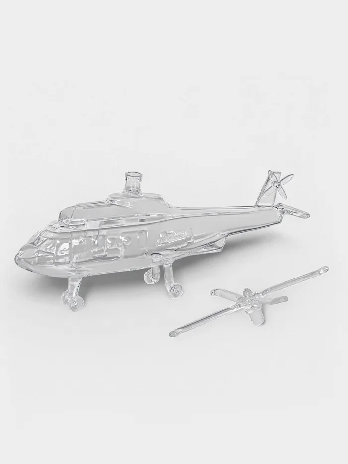 - Необычный дизайн: прозрачное стекло и форма в виде вертолёта делают штоф стильным и привлекательным.