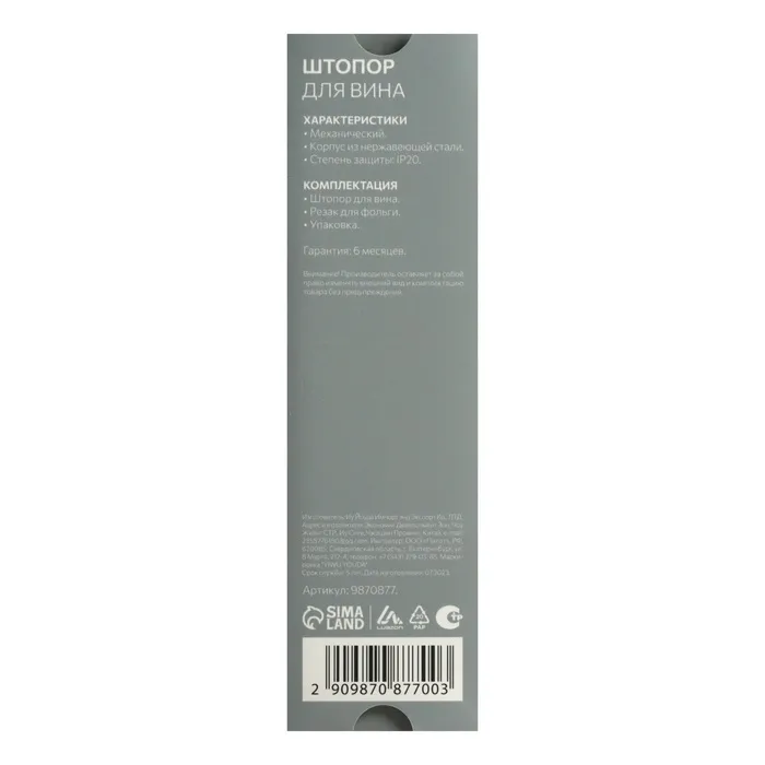 Резак уберет этикетку с бутылки и подготовит её к работе. Штопор легко и быстро откупорит вино. Благодаря механическому действию штопор будет всегда готов к работе. Он не требует использования батареек и подключения к сети, что выделяет его среди остальных приспособлений. Удобная ручка позволяет открыть бутылку, не испытывая при этом болезненных ощущений.