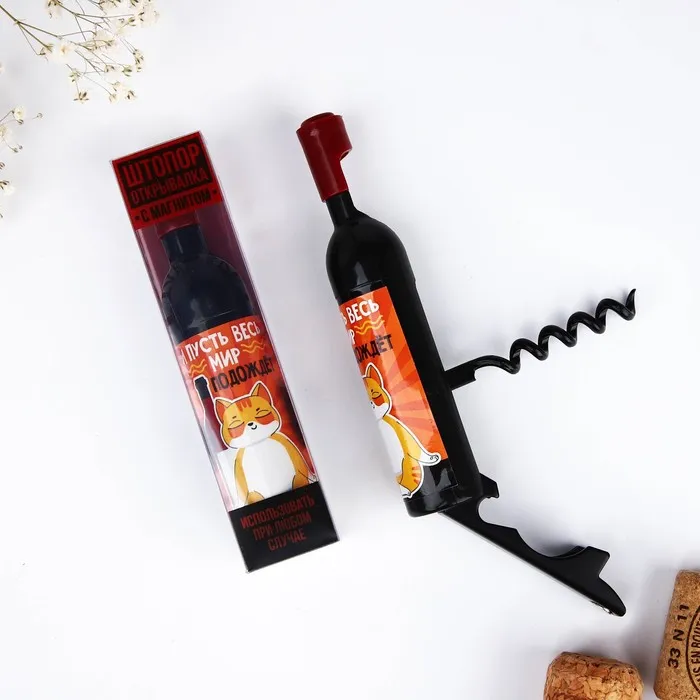 Штопор полезное и удобное приспособление для быта и просто необходимый предмет. Штопор имеет два рычага с помощью которых вы легко сможете вытащить пробку из бутылки. Пробка для бутылки используется для плотного закрытия горлышка. Данный набор станет отличным подарком на любой праздник.