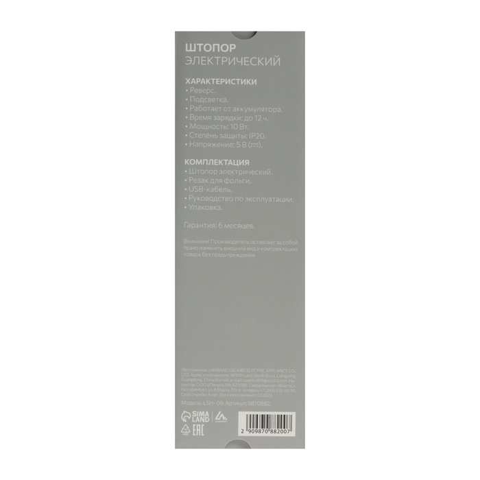 Штопор электрический Luazon LSH- 09, 10 Вт, АКБ, резак для фольги, черный — Характеристики