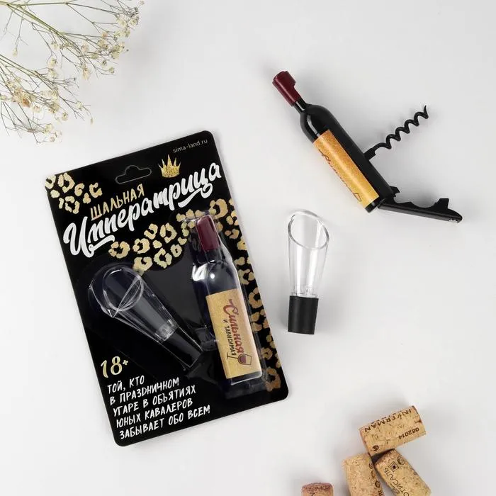 Штопор полезное и удобное приспособление для быта и просто необходимый предмет. Штопор имеет два рычага с помощью которых вы легко сможете вытащить пробку из бутылки. Пробка для бутылки используется для плотного закрытия горлышка. Данный набор станет отличным подарком на любой праздник.