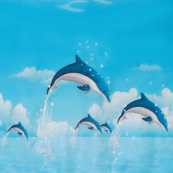 Погрузитесь в атмосферу морского приключения с занавесом для ванной, на котором изображены дельфины, весело прыгающие среди облаков. Этот стильный и яркий аксессуар размером 180×180 см не только украсит вашу ванную комнату, но и создаст уникальную атмосферу уюта и радости.