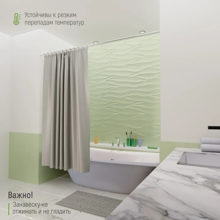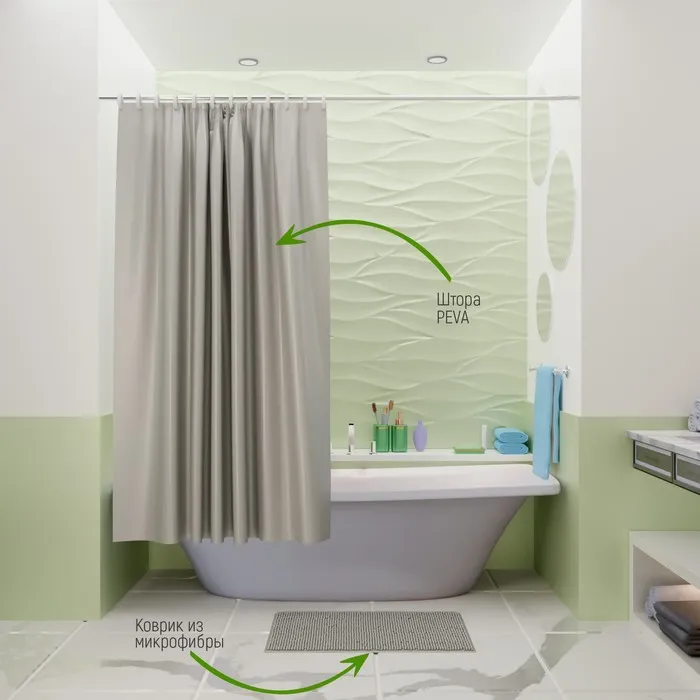 Штора, изготовленная из прочного материала PEVA, обладает водоотталкивающими свойствами, что делает её идеальным решением для влажной среды ванной комнаты. В комплекте предусмотрены кольца для крепления, что обеспечивает быструю и лёгкую установку. Ковёр из микрофибры приятно ощущается под ногами, отлично впитывает влагу и легко чистится.