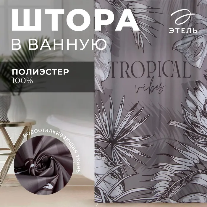 Штора для ванной водоотталкивающая Этель «Tropical vibes», 145×180 см, цвет серый, ткань оксфорд, 210гр/м2 — Характеристики