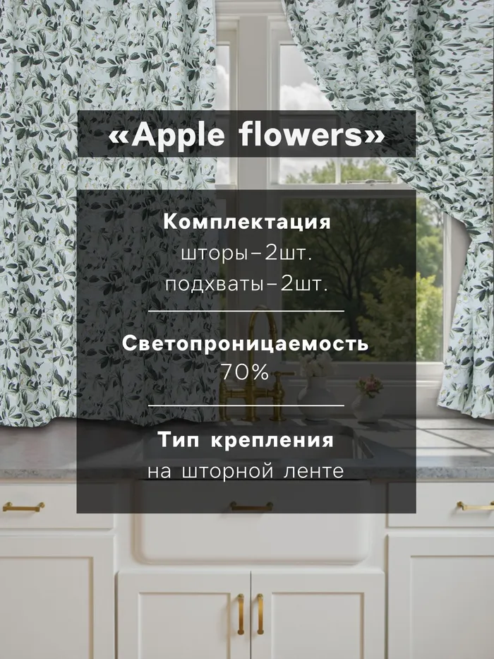 Шторы для кухни Доляна Apple flowers, 146×180 см - 2 шт., подхваты - 2 шт., 100% хлопок, 164 г/м² — Характеристики