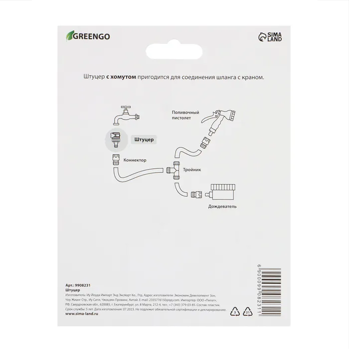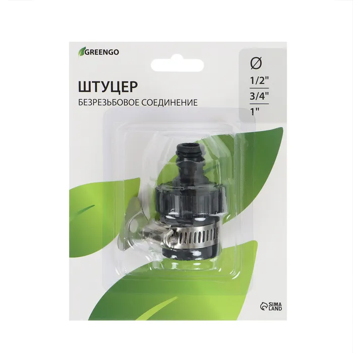 Штуцер безрезьбовой с креплением на кран, 1/2" (12 мм) - 3/4" (19 мм) - 1" (25 мм), с хомутом, быстросъёмное соединение, пластик, резина, Greengo — Характеристики