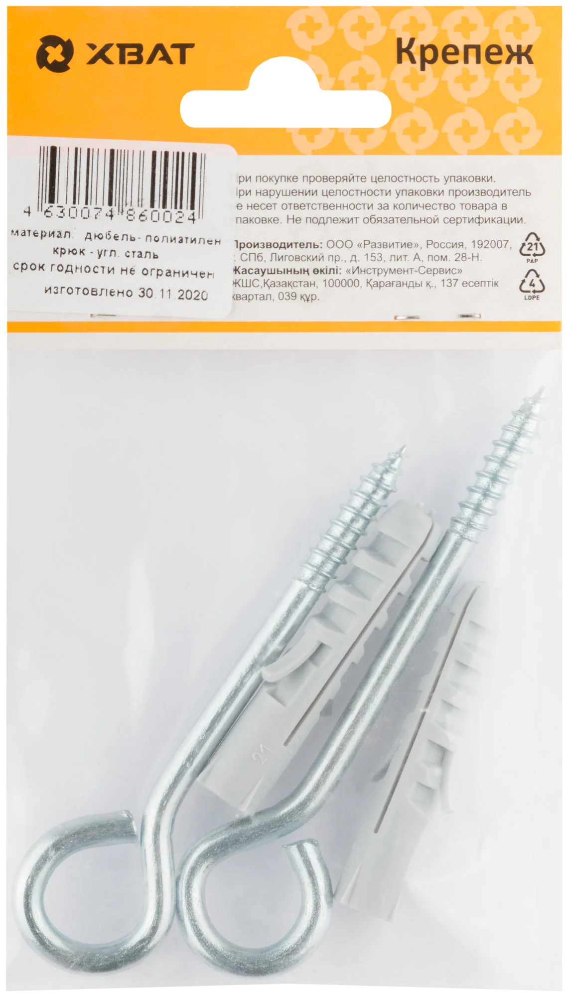Шуруп-кольцо изготовлено из высококачественной стали, покрытой цинковым слоем для дополнительной защиты от ржавчины. В комплект также входит полипропиленовый дюбель, который обеспечивает надежное удержание в стене и предотвращает вырывание при нагрузках.