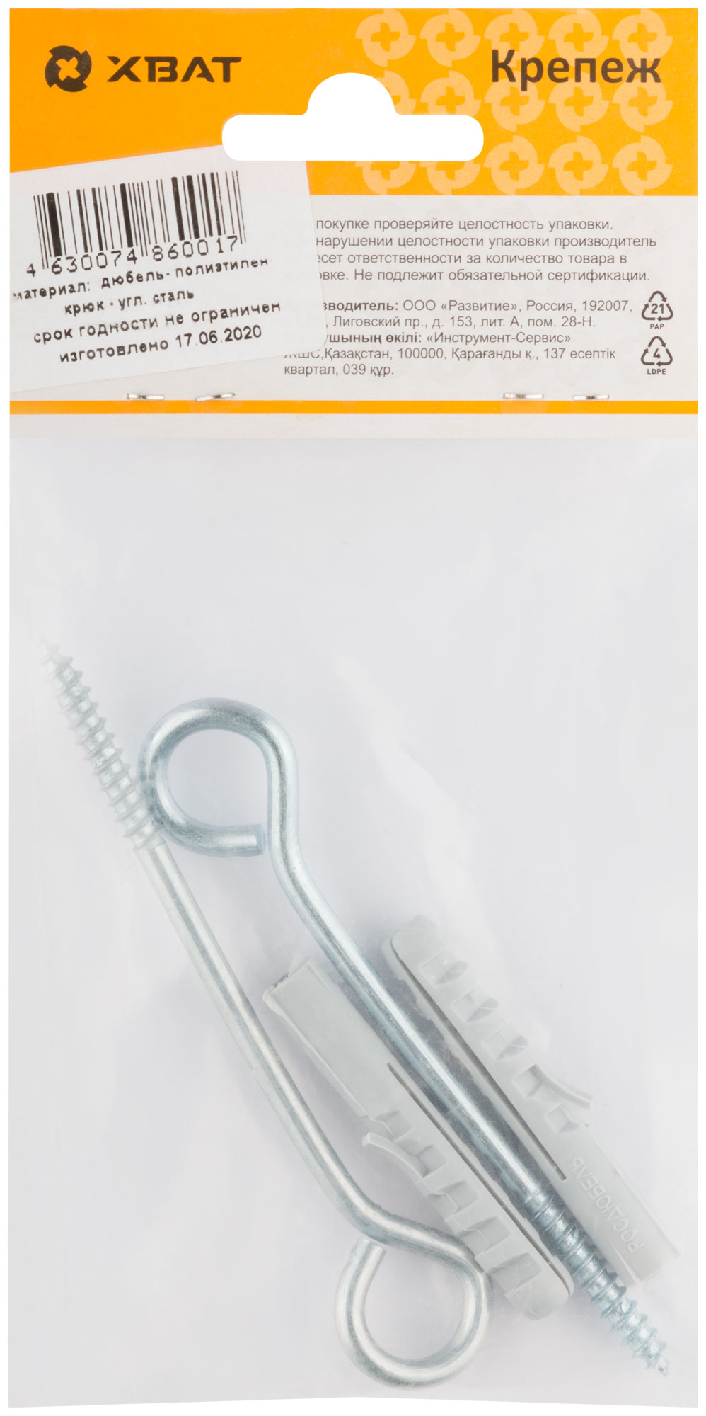 Изготовлено из оцинкованной стали, что обеспечивает длительный срок службы и устойчивость к коррозии. В комплект входят дюбель и шуруп-кольцо, что делает процесс установки легким и быстрым.
