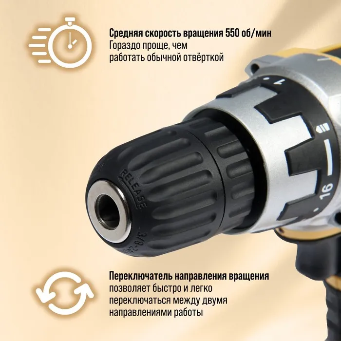 Дрель-шуруповёрт имеет быстрозажимной патрон, что позволит легко и быстро сменить насадки, не отвлекаясь от работы. Подсветка рабочей зоны помогает выполнять точные действия при недостаточном освещении.