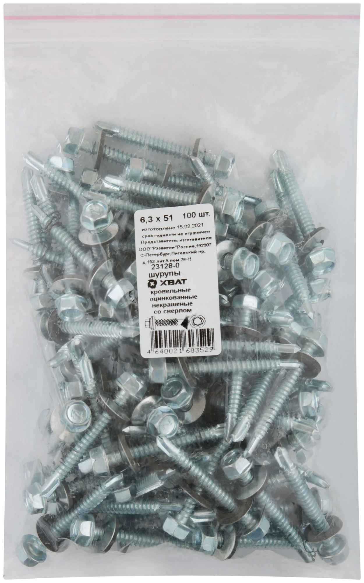 Шурупы XВАТ модели 23128-0 поставляются в упаковке по 100 штук, что делает их удобными для массовых работ. Их типоразмер 6,3 х 51 мм подходит для стандартных задач по креплению кровли.