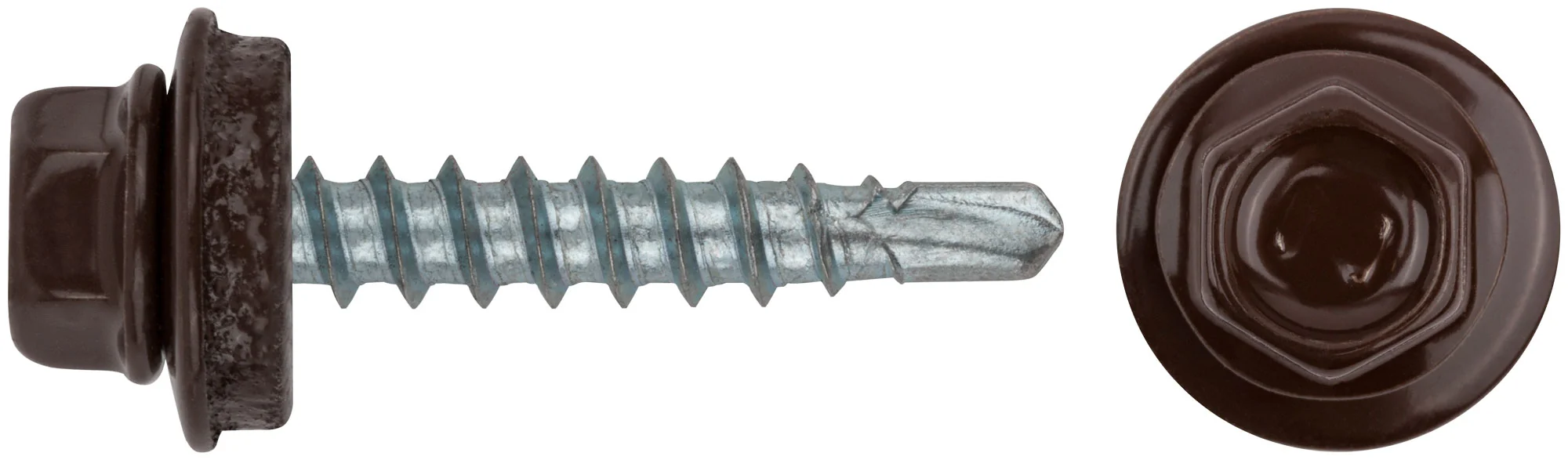 Шурупы изготовлены из оцинкованной стали и покрыты краской в цвет RAL 8017, что обеспечивает долговечность и эстетичность крепления. Прорезиненная шайба гарантирует герметичность и защиту от коррозии.