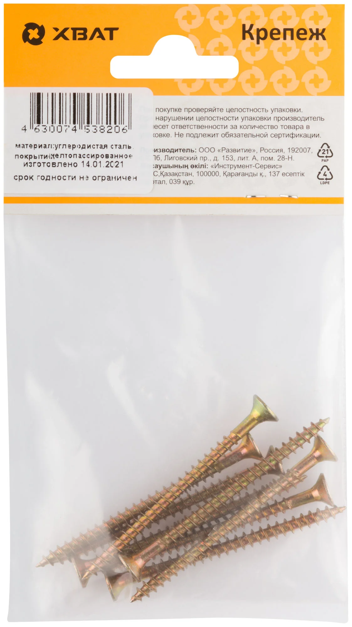 Покрытие из желтопассированного материала защищает шурупы от коррозии, продлевая срок их службы и сохраняя эстетичный вид конструкции. Эти шурупы от бренда XВАТ произведены в России, что гарантирует высокое качество и надежность.