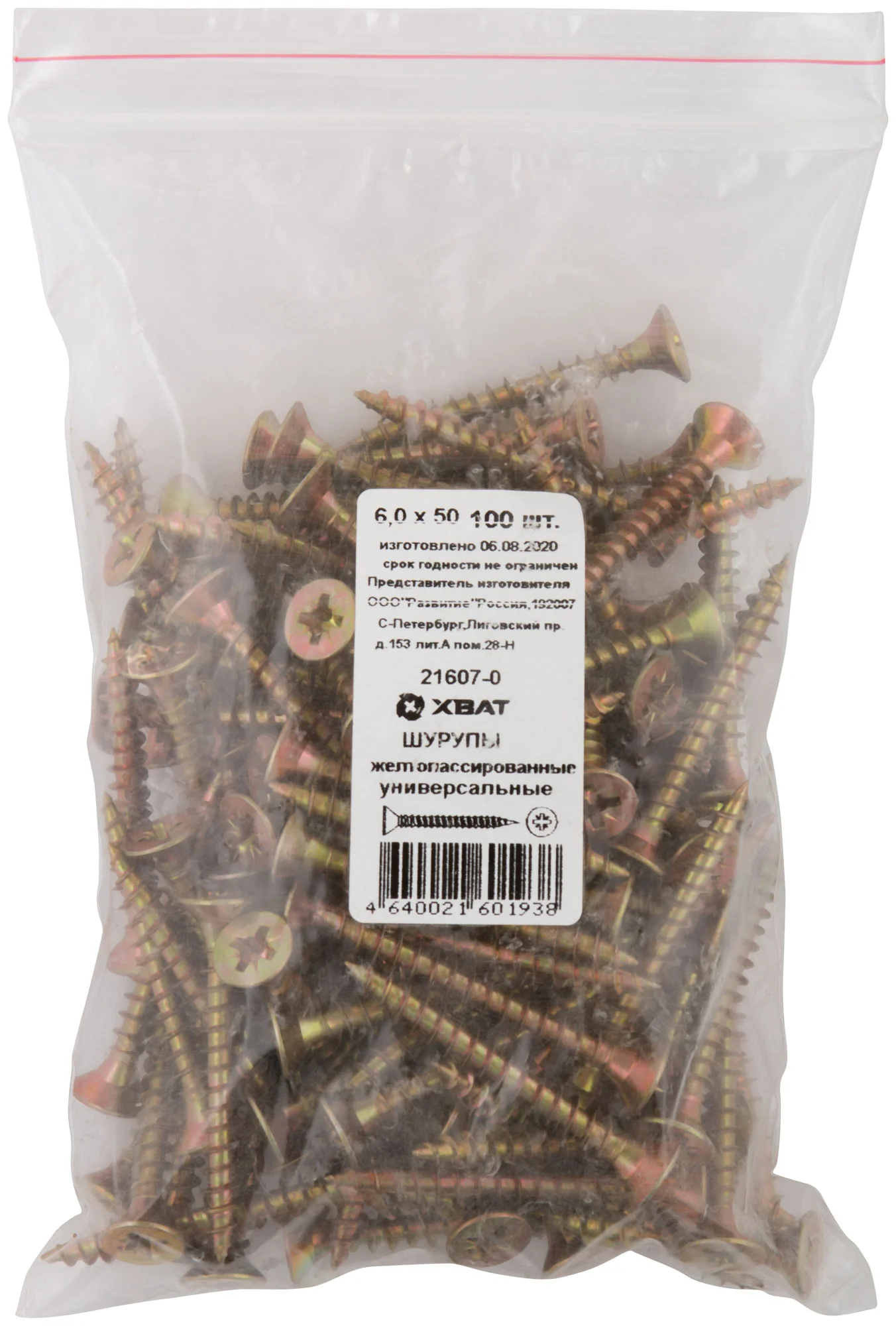 Шурупы изготовлены из высококачественной стали с желтопассированным покрытием, что придаёт им дополнительную устойчивость к коррозии. Универсальный типоразмер 6 х 50 мм позволяет использовать их для различных материалов, таких как дерево, ДСП, фанера, пластик и гипсокартон.