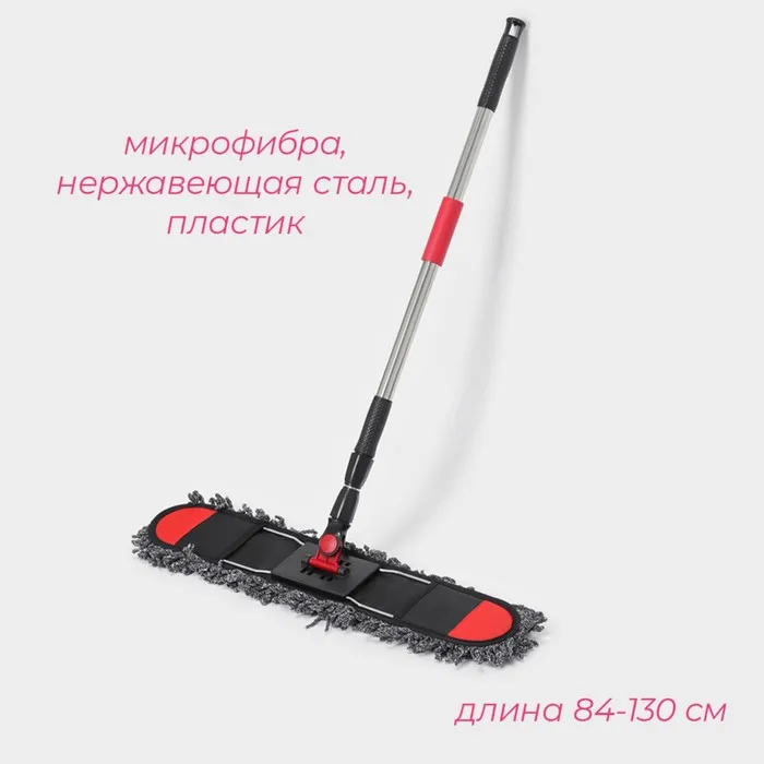 Швабра для мытья пола Доляна, плоская, микрофибра букли, железный флаундер, телескопическая стальная ручка, 62×13×84(130) см — Характеристики