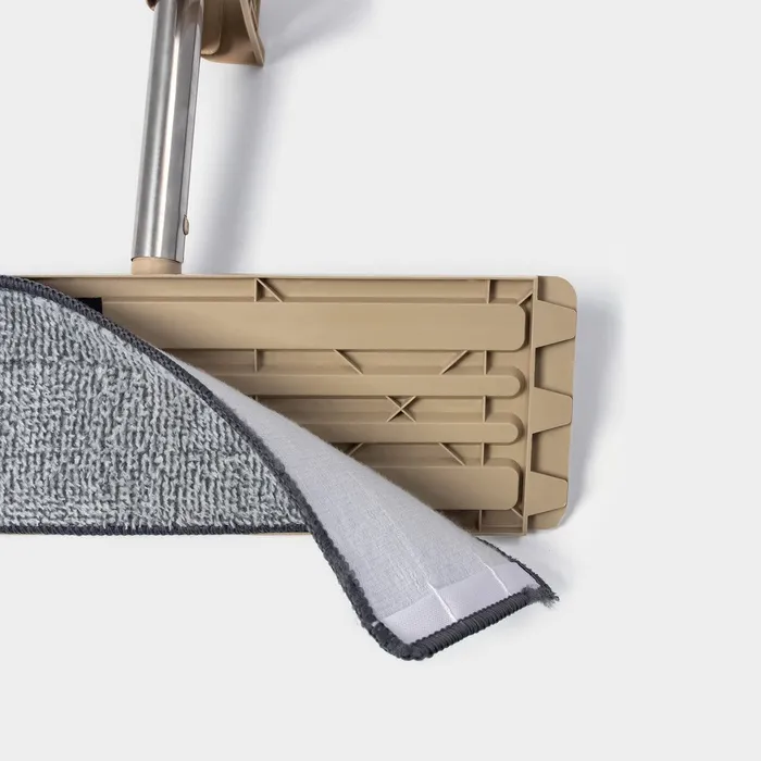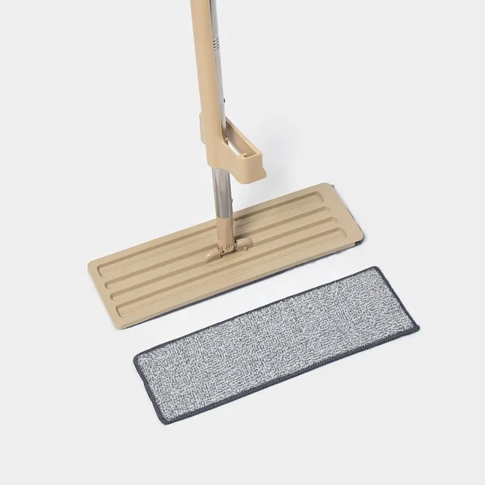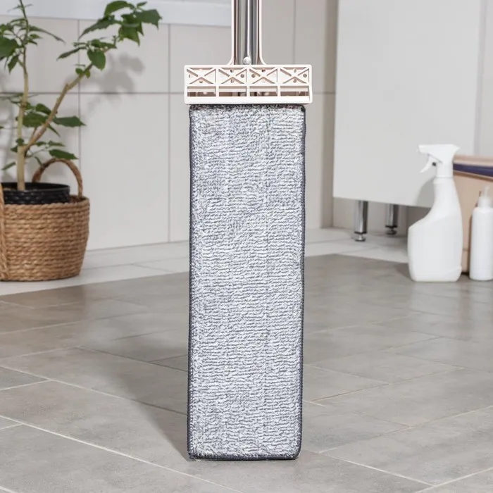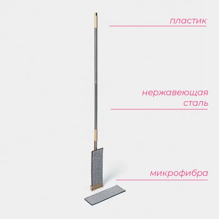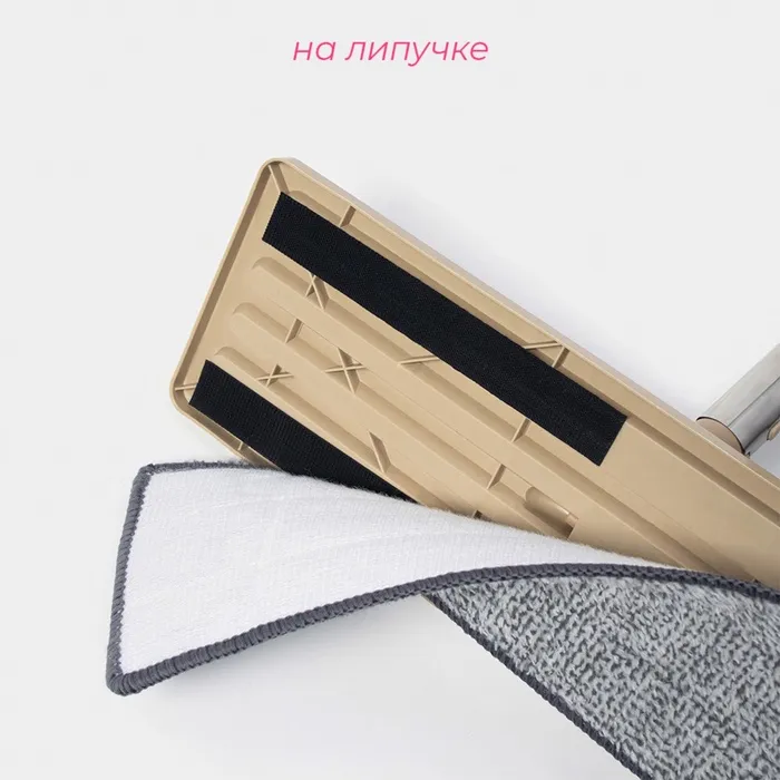 Швабра отлично отмывает любые поверхности. Её насадка сделана из синтетического волокна — микрофибры. Этот материал, в отличие от натурального хлопка, лучше споласкивается, быстро сохнет и препятствует размножению бактерий. Насадка легко снимается одним движением руки.