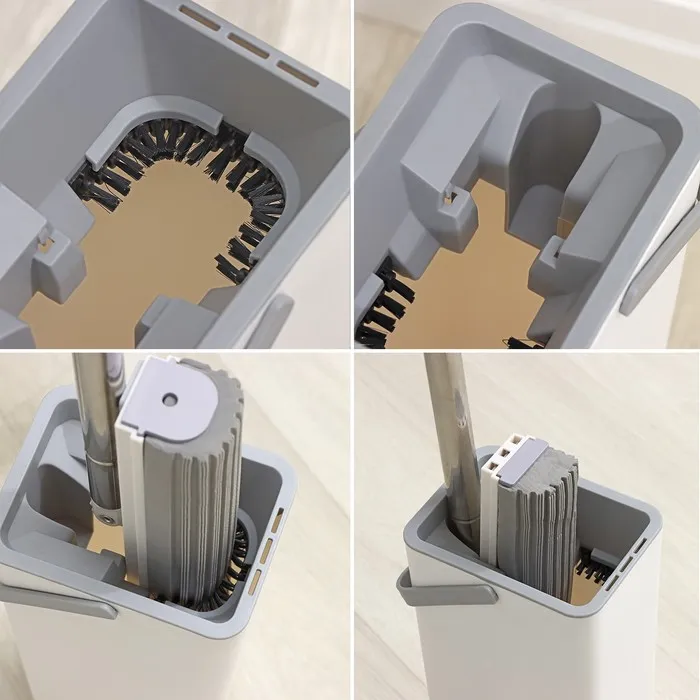 Ведро с системой отжима и полоскания. Система полоскания оснащена щёточками, которые при минимальных усилиях позволяют быстро и эффективно очистить насадку. С помощью системы отжима вы одним нажатием избавитесь от лишней влаги.